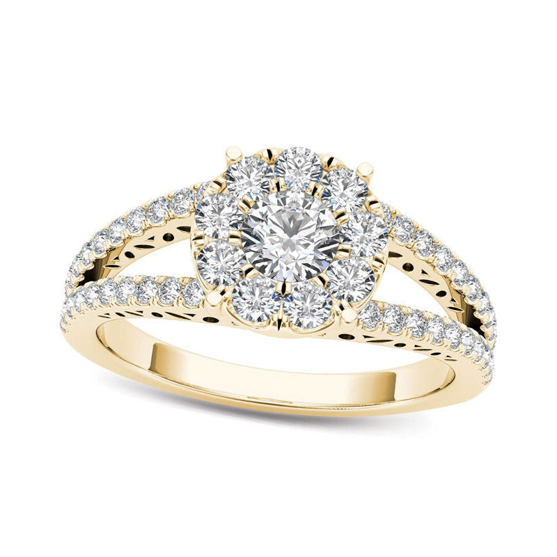 Experience the beauty of true love with our stunning diamond engagement ring. Meticulously crafted in luxurious 14K gold, the focal point of this dazzling ring is a brilliant 1/3 ct. round diamond at its center. Surrounded by a stunning halo frame of smaller accent diamonds, the ring's split shank is also adorned with additional dazzling diamonds. Boasting a remarkable 1 ct. t.w. of diamonds and a polished finish, this engagement ring is a magnificent symbol of your eternal bond. Make your loved one feel truly special with this gorgeous piece of jewelry.