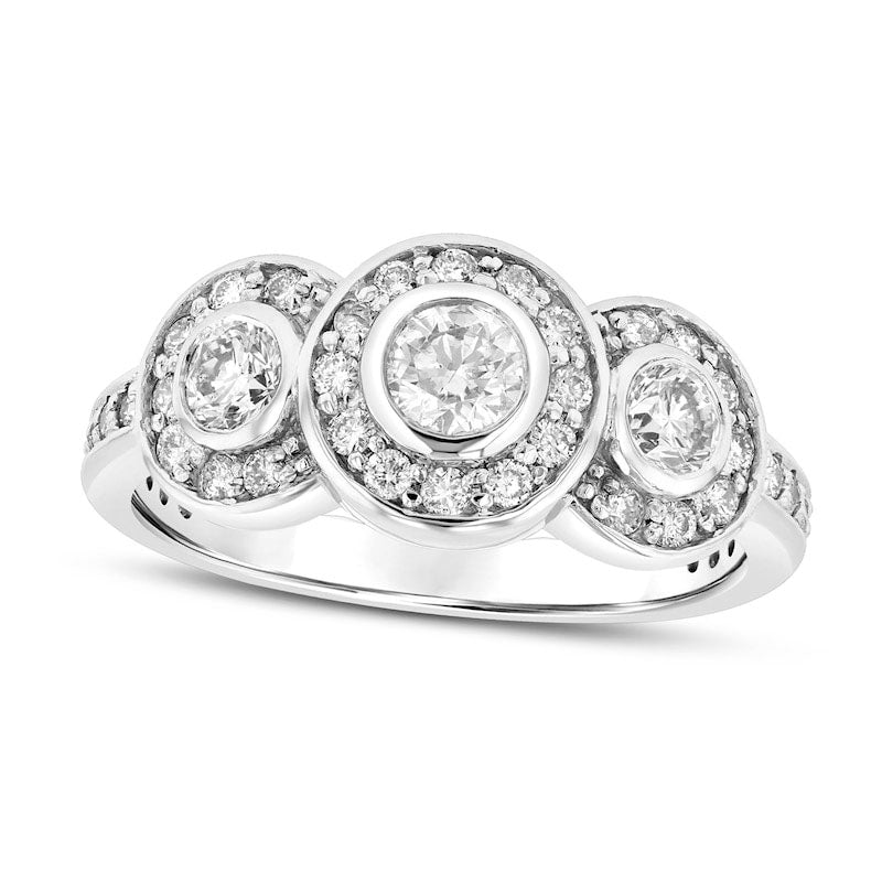 This 14K white gold engagement ring boasts a timeless yet modern design that is sure to capture the heart of your beloved. Featuring a trio of dazzling diamonds, including a 1/4 ct. center stone and two 1/6 ct. side stones, each of which is surrounded by a glittering diamond halo, this three-stone style is truly breathtaking. The band is also adorned with additional diamonds, adding even more sparkle to this already stunning piece. Radiating with 1 ct. t.w. of diamonds and brilliantly polished, this engagement ring is the ultimate symbol of your enduring love.