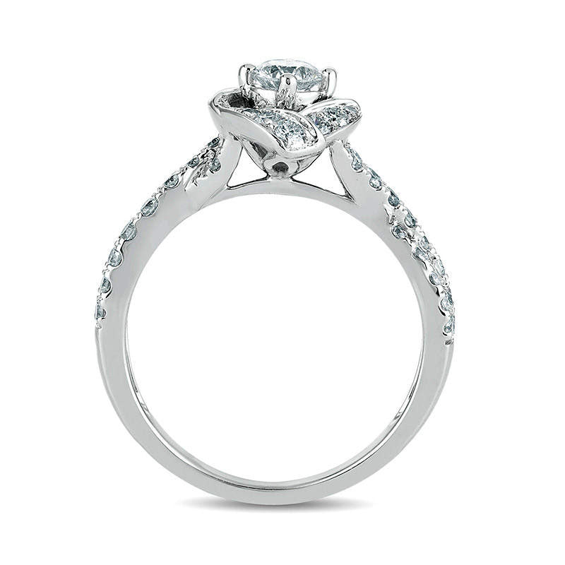 Declare your love with this captivating diamond engagement ring. Constructed in 14K white gold, this exquisite ring showcases a stunning 1/3 ct. center diamond enveloped by a dazzling twist of diamonds in a marquise shape knot. The crossover shank is embellished with two ribbons of diamonds, adding even more brilliance to the ring. A total diamond weight of 1 ct. and a radiant polished finish complete this engagement ring, making it a memento of a treasured memory that will last forever.