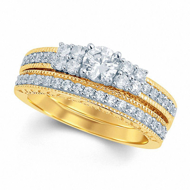 Looking for a stunning way to pop the question? Look no further than this stunning diamond bridal set. With a gorgeous 3/8 ct. diamond at the center, this 14K gold engagement ring is adorned with quad collars of smaller diamonds for added shimmer. Intricate milgrain detailing and patterns along the sides add a vintage-inspired touch that is sure to impress. And when it comes to your big day, a matching diamond-lined band completes the look. With 1 ct. t.w. of diamonds and a brilliant buffed finish, this bridal set is sure to sparkle for years to come.