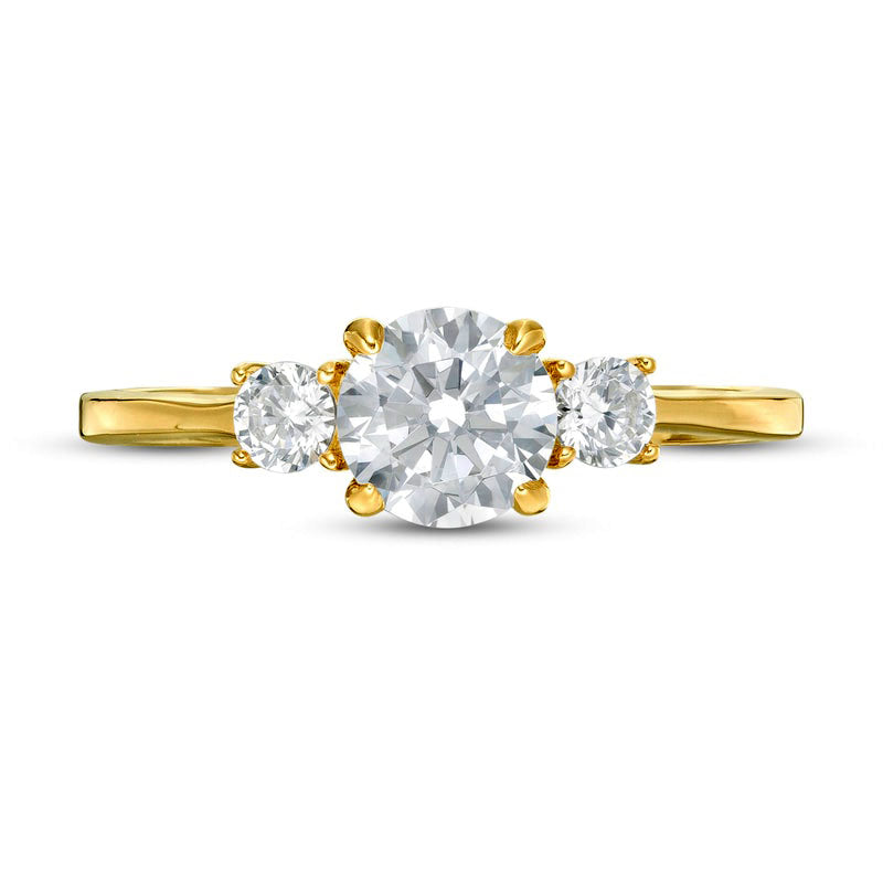 The '1 CT. T.W. Diamond Three Stone Engagement Ring' is a timeless piece that embodies your love story. Made from 14K gold, it features a breathtaking 3/4 ct. center diamond,...