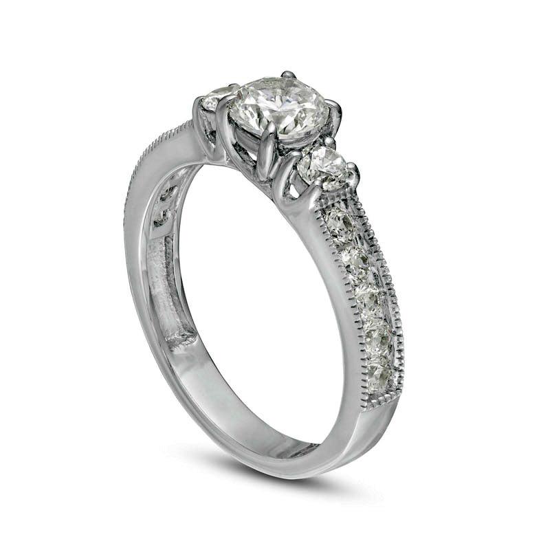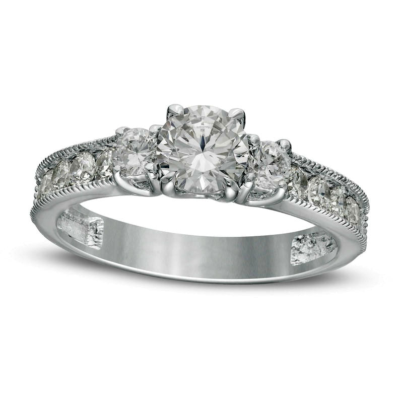 Looking for a stunning engagement ring that will take her breath away? Look no further than this magnificent diamond ring. Crafted from 14K white gold, it features a bold 1/2 ct. diamond at its center, flanked on each side by a 1/10 ct. diamond for a dazzling three-stone design. The shank of the ring is also adorned with diamond accents, adding even more sparkle and shine. With a total weight of 1 ct. t.w. and a stunning, polished finish, this engagement ring is the ultimate symbol of your love and devotion. Give her the gift of a lifetime with this incredible diamond ring.