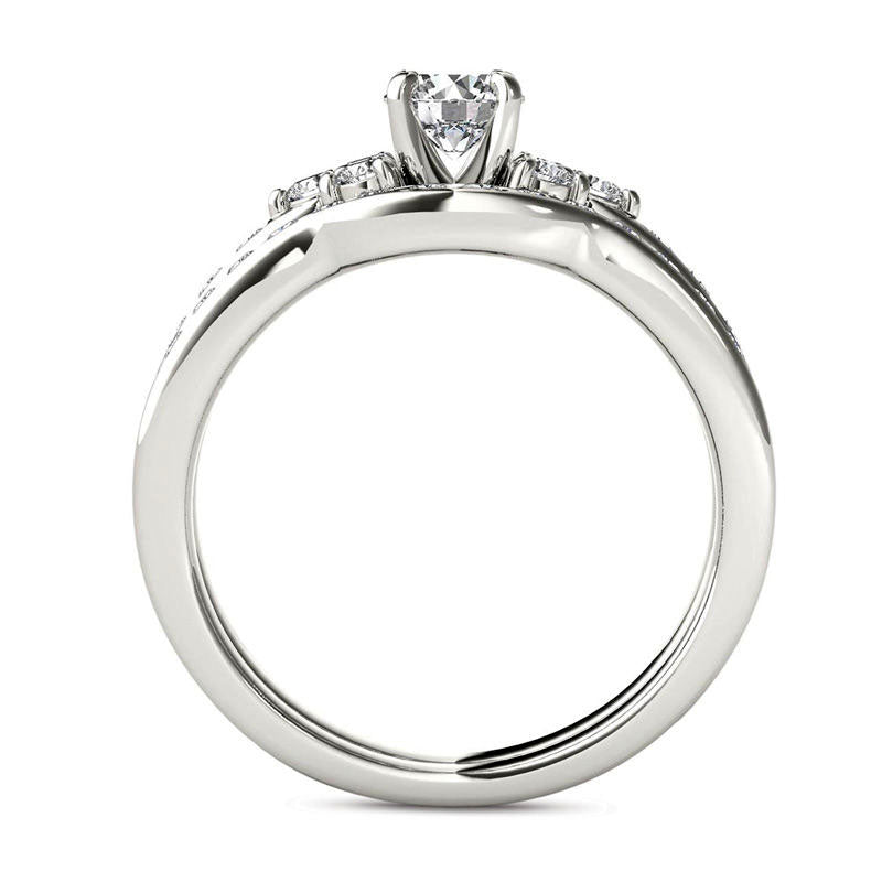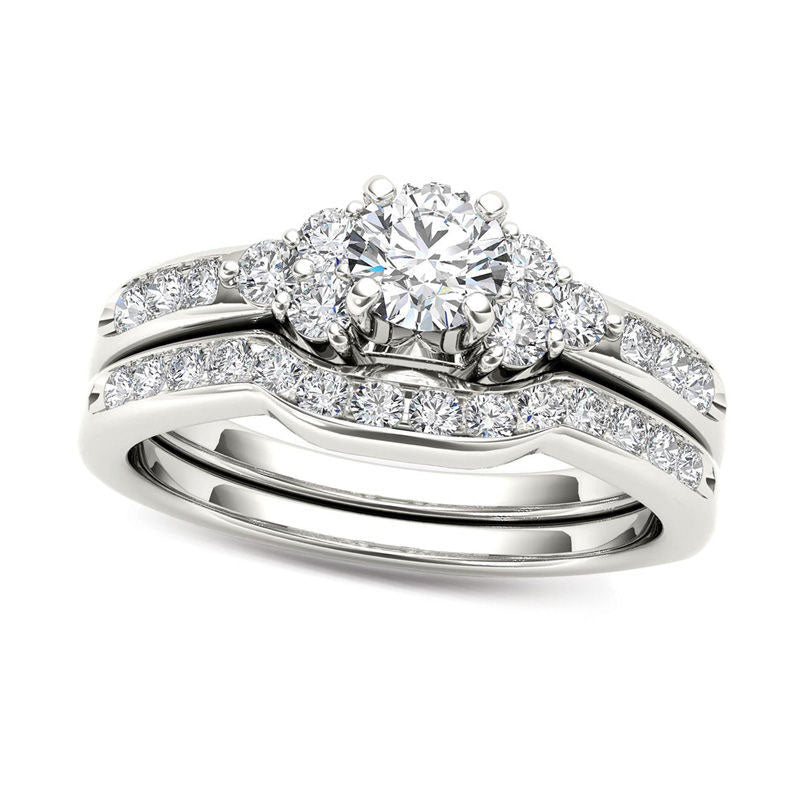 Celebrate your special day with the breathtaking elegance of this diamond bridal set. Meticulously crafted in lustrous 14K white gold, the engagement ring features a dazzling 1/2 ct. round diamond at its center. The center stone is flanked by three smaller round accent diamonds on each side, and the ring's shank is adorned with more diamonds for added brilliance. The matching contoured wedding band seamlessly fits with the engagement ring, completing the captivating look of this stunning set. As a beautiful symbol of your love and devotion, this exceptional bridal set showcases a total weight of 1 ct. of sparkling diamonds and a brilliant, polished finish.