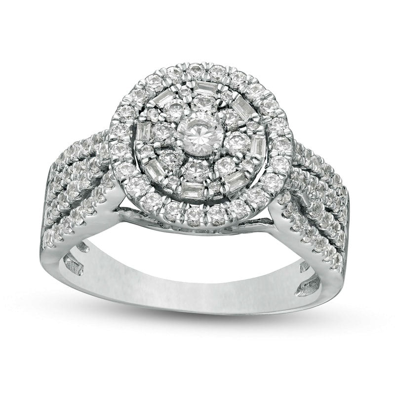 This breathtaking diamond engagement ring is the ultimate symbol of your love. Made with lustrous 10K white gold, it boasts an impressive 1/10 ct. diamond at its center, surrounded by three sparkling frames. Two of these frames showcase dazzling round diamonds, while the inner halo features an alternating pattern of round and baguette-cut diamonds. The shank is designed with multiple rows of diamonds, elegantly crossing over each other. With an incredible 1 ct. t.w. of diamonds and a brilliant buffed finish, this engagement ring is sure to create a memorable and cherished moment.