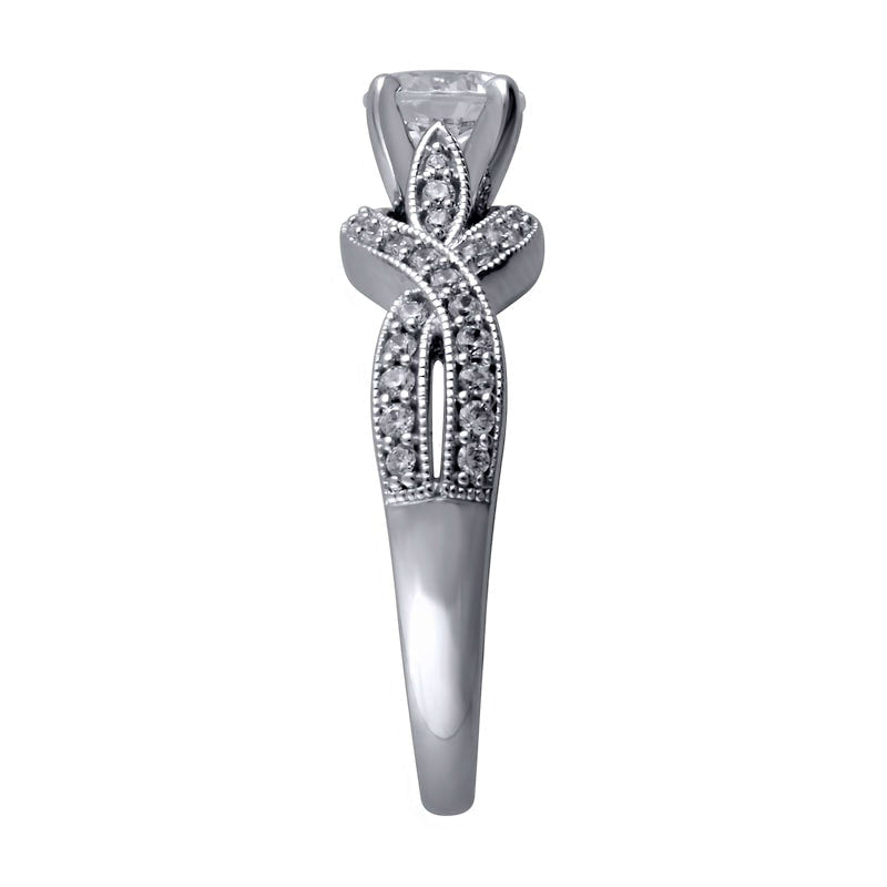This stunning diamond engagement ring exudes elegance and romance, offering a timeless symbol of your love. Crafted in 14K white gold, the vintage-inspired design showcases a dazzling 3/4 carat center diamond. The shank sparkles with intricate milgrain detailing, twist ribbons, and petal-shaped accents, all adorned with 1 carat total weight of diamonds. Radiant and polished to a bright shine, this engagement ring is a precious keepsake that is sure to be cherished for years to come.