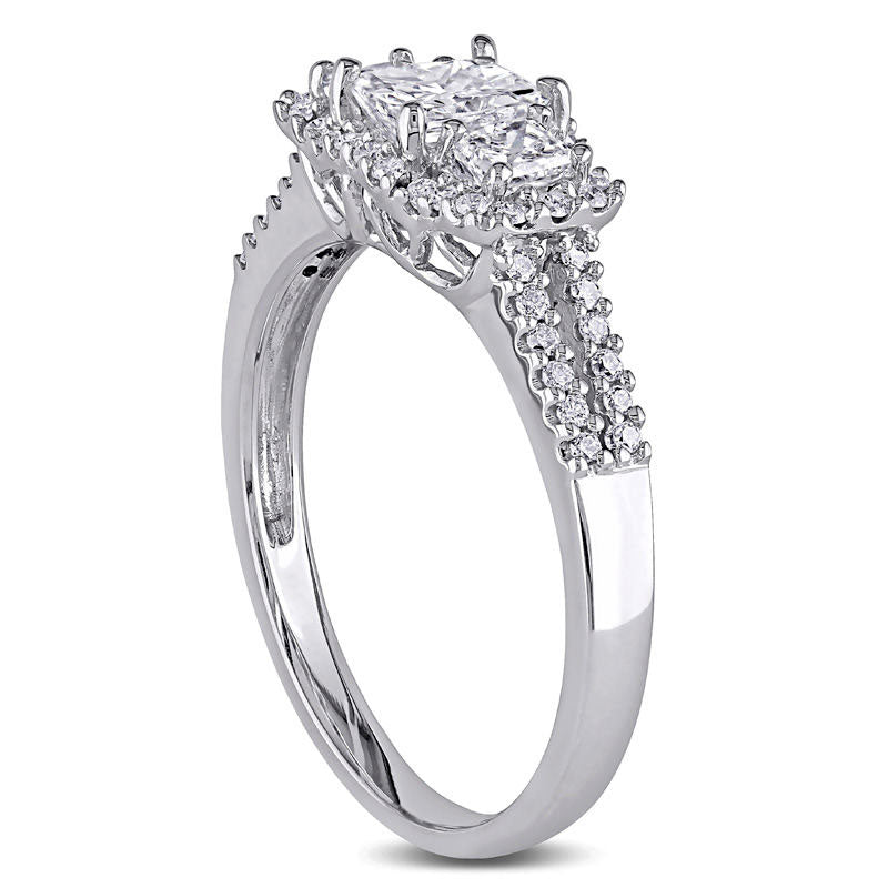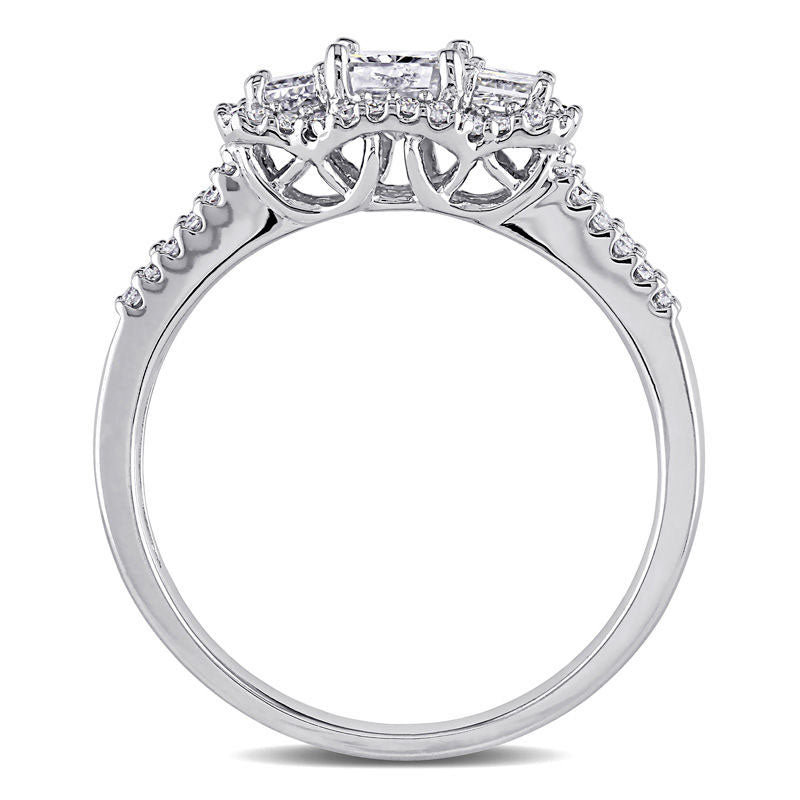 Celebrate your love with this exquisite 14K white gold diamond engagement ring. Boasting a total of 1 ct. t.w. of radiant-cut and round diamonds, it is a breathtaking choice. The centerpiece is a sparkling 1/2 ct. radiant-cut diamond, flanked by two alluring 1/8 ct. radiant-cut diamonds. The trio is wrapped in a frame of smaller round diamonds, cascading an endless shimmer. The double-row shank is also adorned with diamonds, adding to the ring's luxurious style. With its remarkable design and brilliant buffed luster, this three stone engagement ring is a stunning symbol of your love.