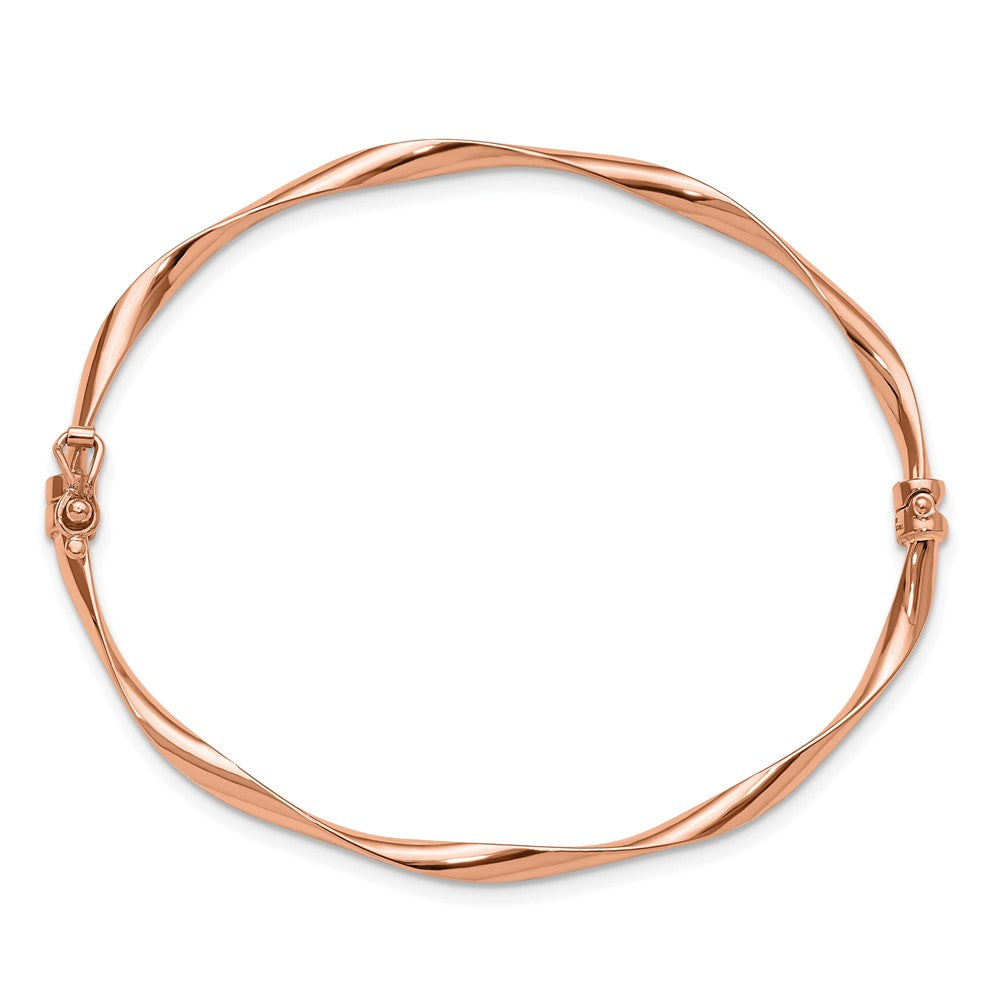 Show off style with the 10K Rose Gold Polished Hinged Bangle. Crafted from durable 10K rose gold, this bracelet boasts a sleek, polished finish that catches the light. Its hinged clasp ensures a secure fit for everyday wear, while the safety clasp provides extra peace of mind. With a slim 3mm width, the hollow design adds a touch of elegance without feeling bulky. Perfect for women who love classic shimmer, the 10K Rose Gold Polished Hinged Bangle offers a timeless appeal. Backed by a lifetime guarantee, this bracelet is a jewelry piece you'll treasure for years.