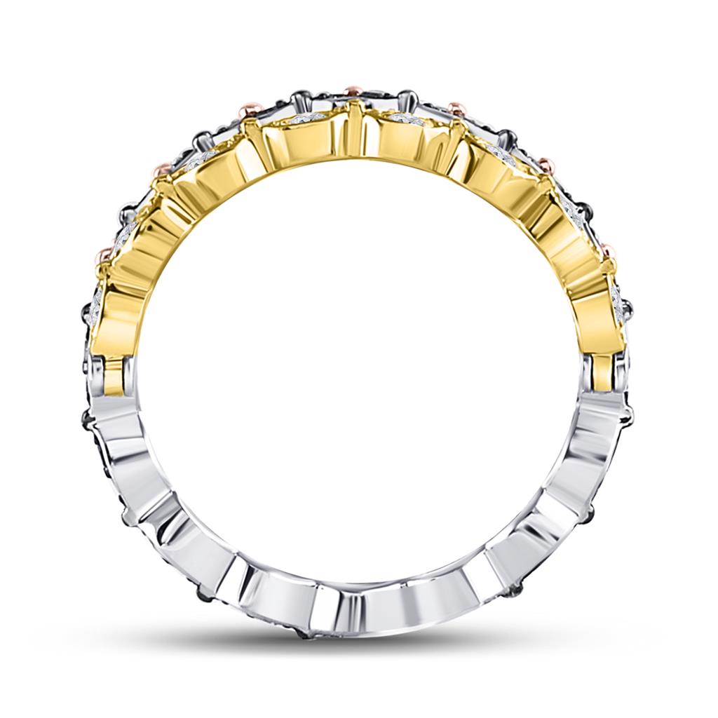 This stunning piece of jewelry is titled the "10k Tri-Tone Gold Round Brown Diamond Convertible Band Ring 3/8 Cttw". Crafted from premium 10kt tri-tone gold, this ring boasts a total...