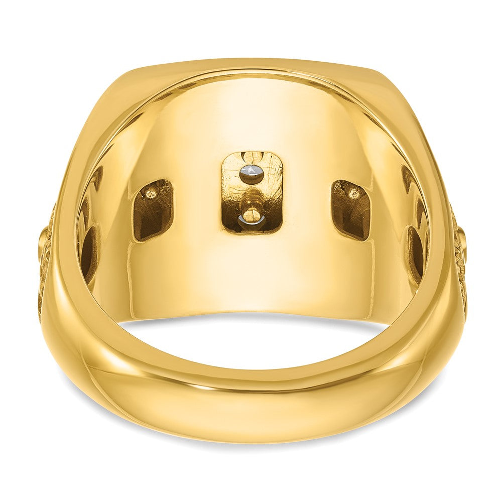 The 10K Two-Tone Ibgoodman Black Enamel Men's Ring boasts a striking design for those with discerning taste. Crafted from polished gold, this ring features a fascinating blend of textures and impeccable detail. At its heart, a diamond cluster weighing 1 carat forms a brilliant centerpiece, with each stone carefully faceted to catch the light. The round, white diamonds are set against a black enamel backdrop, creating a timeless stars and stripes motif. Ideal for the modern gentleman, this piece combines elegance with bold style. Make the 10K Two-Tone Ibgoodman Ring your statement accessory.