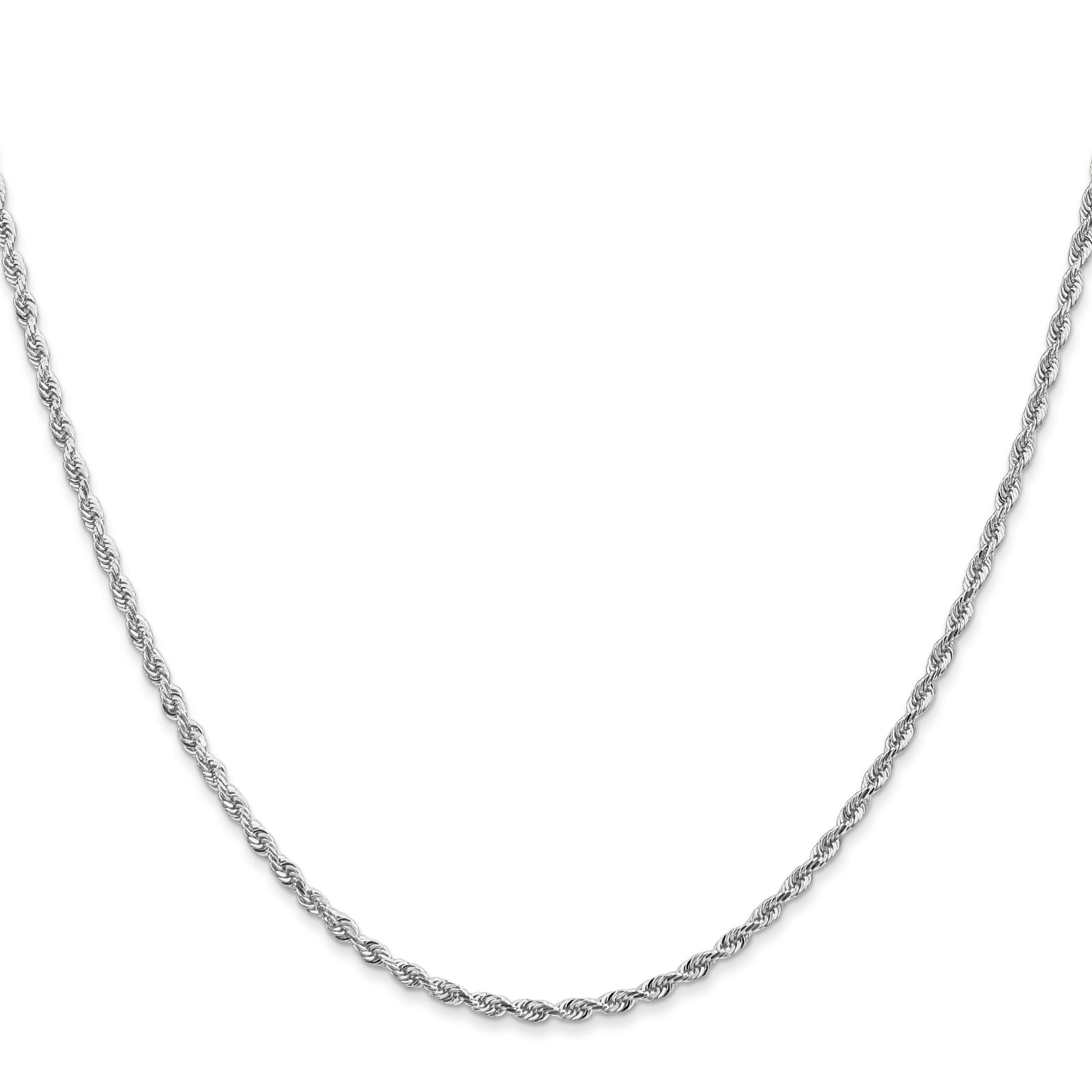 The 10K White Gold 2mm D/C Quadruple Rope Chain stands out with its polished finish and diamond-cut texture. Crafted from 10K gold, this chain ensures both elegance and durability. Its 20-inch length makes it perfect for layering or wearing alone for a classic look. Covered in rhodium plating, the chain maintains a bright white hue while offering extra resistance to tarnish. The lobster clasp ensures secure wear. This solid, 2mm wide piece is a sophisticated choice for any jewelry collection. Add the 10K White Gold 2mm D/C Quadruple Rope Chain to your ensemble for timeless style.