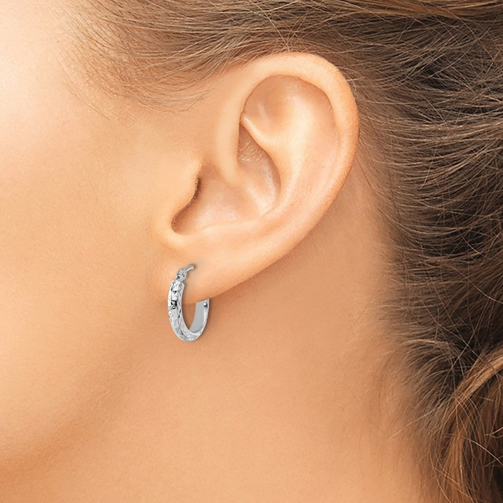 The 10K White Gold D/C 2.8X15mm Hollow Hoop Earrings add a sleek touch to any look. Made from pure 10K white gold, these earrings feature a shiny polish finish with a diamond-cut texture that catches the light. The hollow design makes them lightweight and comfy to wear for hours. At 15mm wide and 2.8mm thick, they strike the perfect balance of size and style. The silver-tone rhodium plating adds extra shine and durability. These hoop earrings come in a pair and are secured with wire and clutch closures. The 10K White Gold D/C 2.8X15mm Hollow Hoop Earrings come with a lifetime guarantee for quality you can trust.