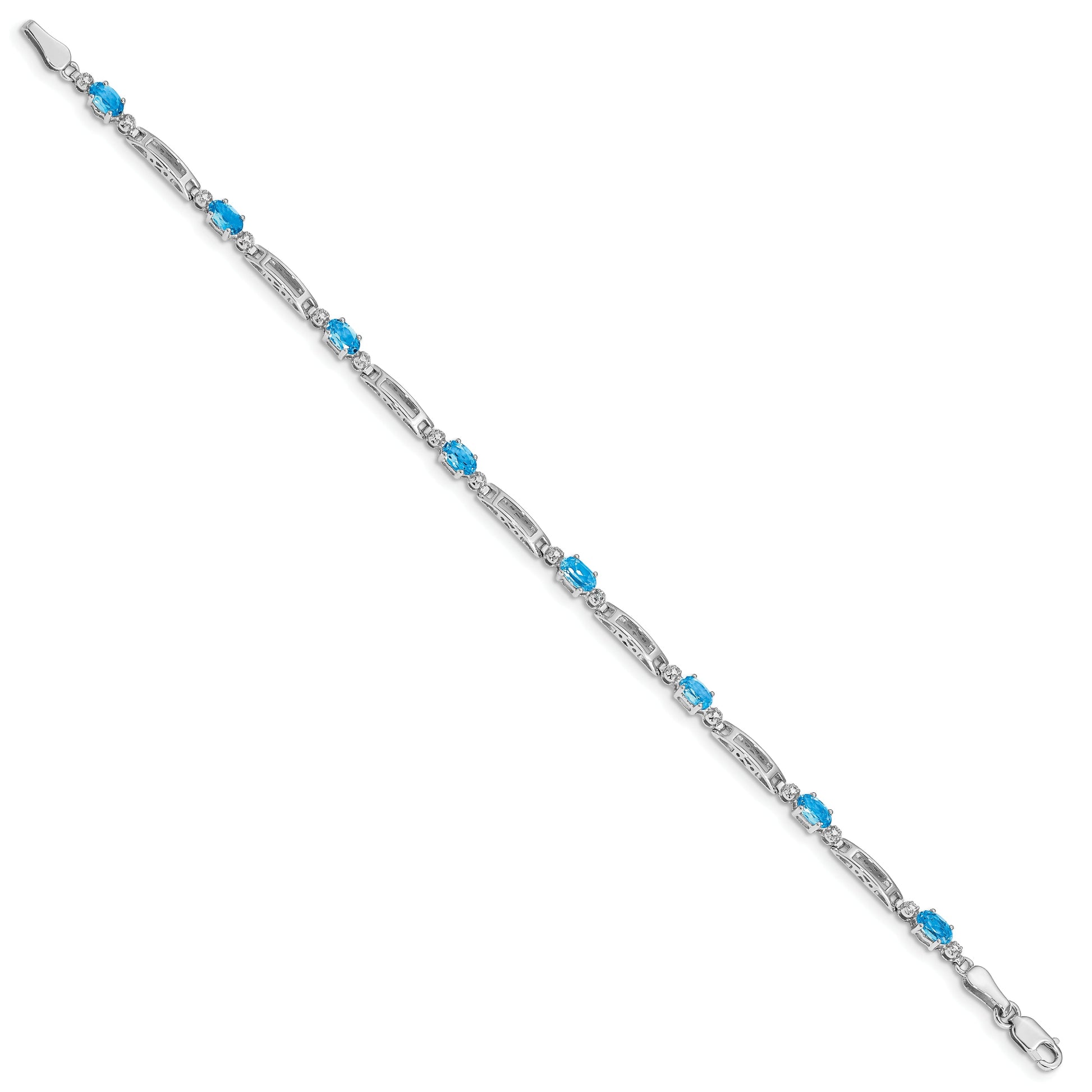 The 10K White Gold Diamond and Blue Topaz Bracelet is an exquisite choice for any discerning jewelry lover. Crafted in gleaming 10K white gold and gracefully finished with polished rhodium, this bracelet measures 7 inches long. It features eight Swiss Blue Topaz stones, brilliantly oval-cut, and a single, round, dazzling diamond. These gemstones sparkle harmoniously, offering a captivating contrast of cool blue and perfect clarity. The secure lobster clasp ensures a comfortable fit. Measuring 3.5 mm in width, this piece boasts a timeless design and unmatched elegance, making the 10K White Gold Diamond and Blue Topaz Bracelet a must-have for any woman's collection.