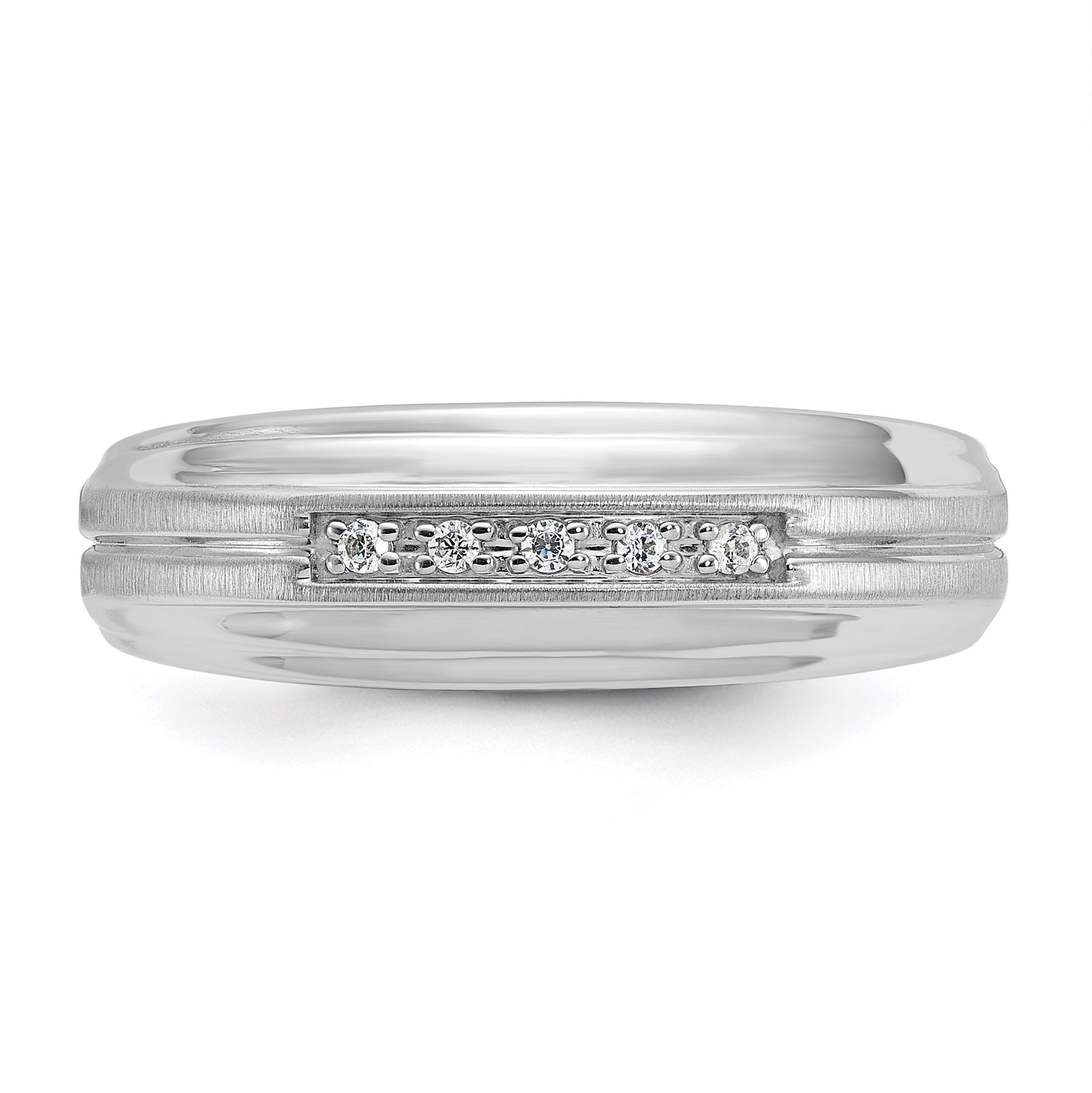 Introducing the 10K White Gold Ibgoodman Men's Polished Satin and Grooved 5-Stone Diamond Ring, a true masterpiece of elegance. Crafted from 10K white gold and plated with rhodium, this ring embodies timeless style with a polished finish that catches the eye. The ring proudly displays five round, faceted diamonds, amounting to a total carat weight of 1/20. Each diamond radiates with grade A quality and a clarity rating of I2, offering a stunning sparkle. With a 7.16 mm band width, this ring is a comfortable fit for any occasion. Elevate your style with the 10K White Gold Ibgoodman Men's Polished Satin and Grooved 5-Stone Diamond Ring.