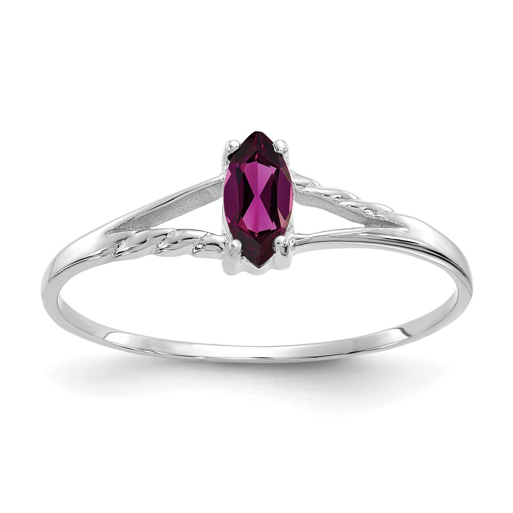 This stunning ring is a perfect gift for someone born in June or those who love a vibrant and deep red color. This birthstone ring is made of high-quality 10K white gold, making it a durable and long-lasting accessory. The marquise-shaped rhodolite garnet stone at the center adds a touch of elegance to the ring. The stone is not enhanced, which makes it even more special. The ring also has side stone mountings adding an extra touch of beauty. The rhodium plating gives the ring a polished finish and adds more durability to the overall design. This gorgeous ring weighs only 0.85 grams and is available in various sizes. It is perfect for any occasion, be it formal or casual, enhancing any outfit you wear. You'll love this stunning piece of jewelry!