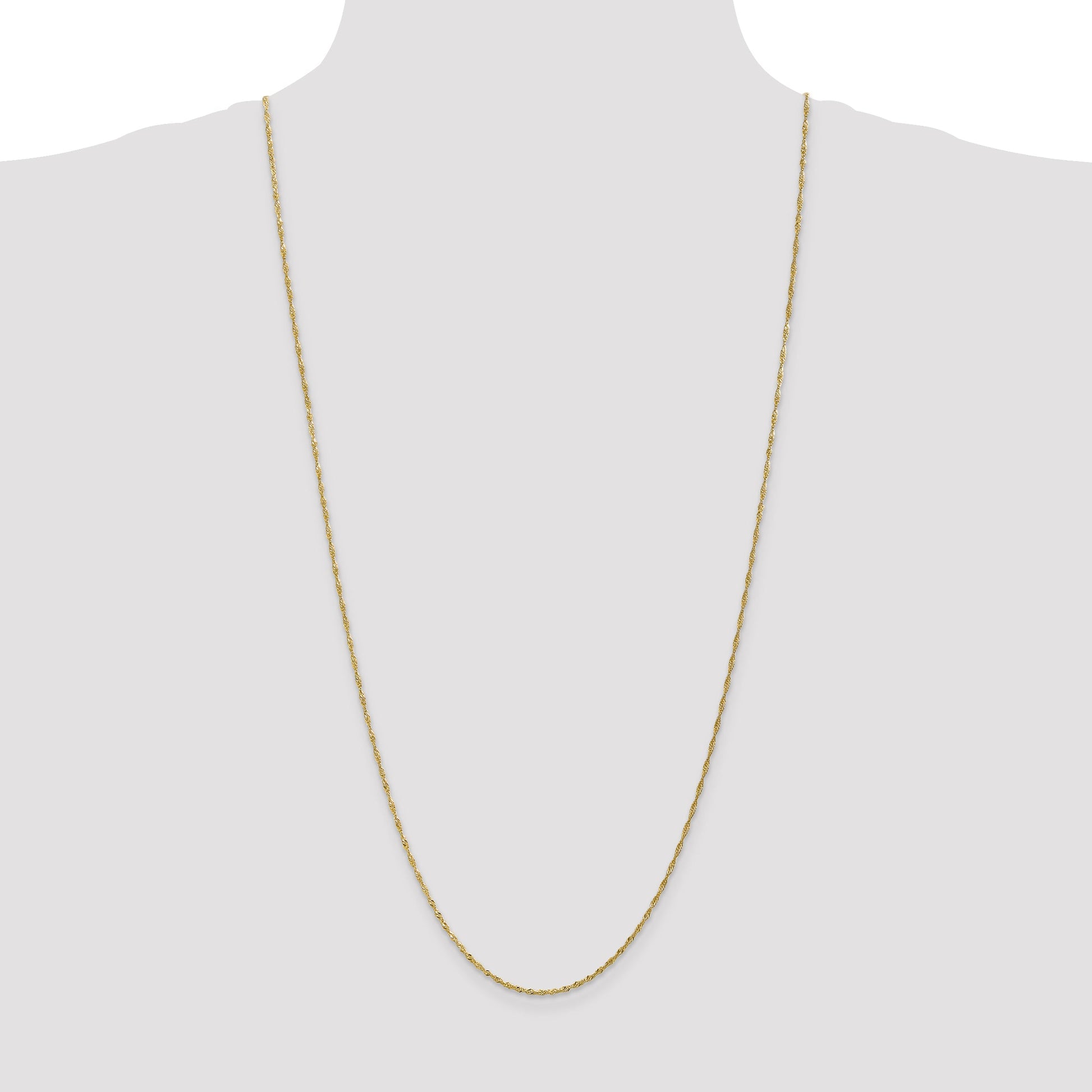 The 10K Yellow Gold 1.4mm Singapore Chain is a true work of art. Crafted from pure 10K gold, its polished finish catches the light with every move you make. Measuring 30 inches in length, this necklace sits perfectly around your neck, enhancing any outfit. Its Singapore design, known for its twisted, lightweight feel, adds a subtle elegance. The chain, 1.4mm wide, is durable yet delicate, making it suitable for everyday wear or special occasions. Secured with a reliable spring ring clasp, the 10K Yellow Gold 1.4mm Singapore Chain is the perfect blend of style and substance.