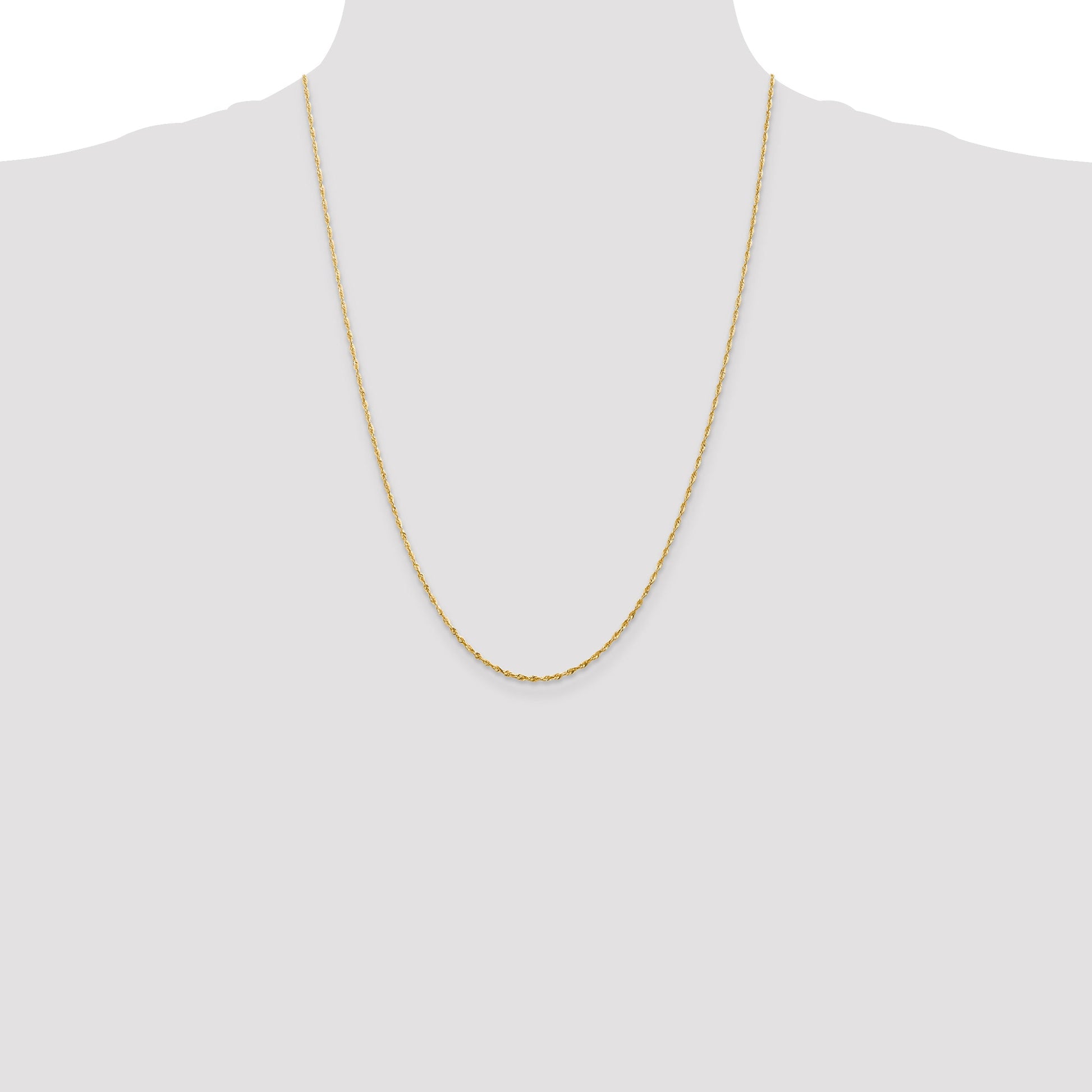 Introducing the 10K Yellow Gold 1.5mm Extra-Light D/C Rope Chain – a blend of sophistication and subtle elegance. Crafted from polished 10K yellow gold, this 24-inch chain adds shine and style to any outfit. The diamond-cut texture enhances its allure, catching light with every movement. Its 1.5mm width offers a delicate yet solid feel, perfect for layering with other pieces. The lobster clasp ensures secure wear for all occasions. Embrace timeless grace with the versatile 10K Yellow Gold 1.5mm Extra-Light D/C Rope Chain.