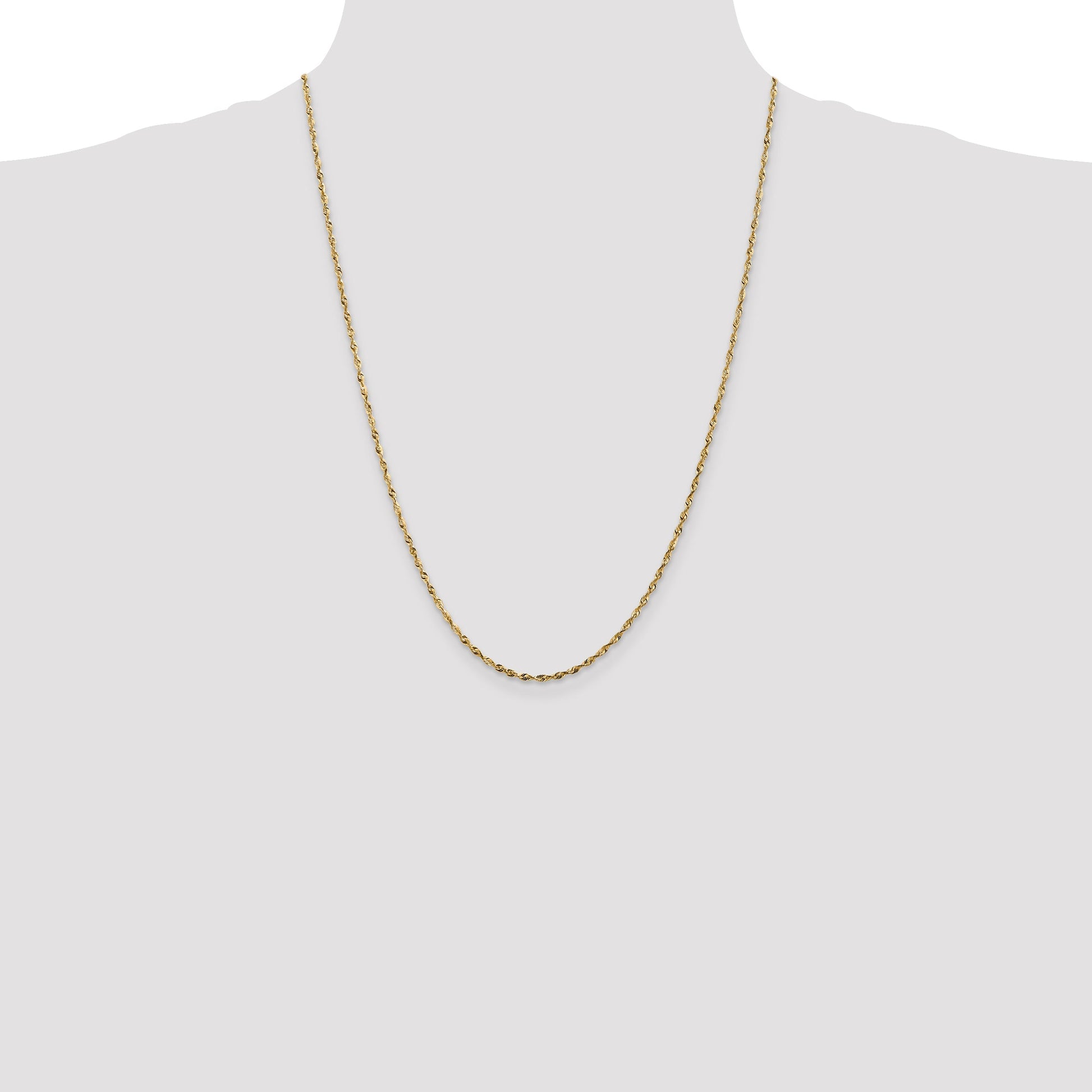 The 10K Yellow Gold 1.8mm Extra-Light D/C Rope Chain is a stunning piece of fine jewelry that adds a touch of elegance to any look. Crafted from high-quality 10K gold, this chain offers a polished finish that gleams brilliantly. Measuring 24 inches in length, it features a sleek, 1.8mm diamond-cut rope design, ensuring durability and a subtle sparkle. The lobster clasp ensures secure wear, while its lightweight nature makes it comfortable for all-day wear. Perfect for layering or wearing solo, the 10K Yellow Gold 1.8mm Extra-Light D/C Rope Chain is a timeless addition to any jewelry collection.