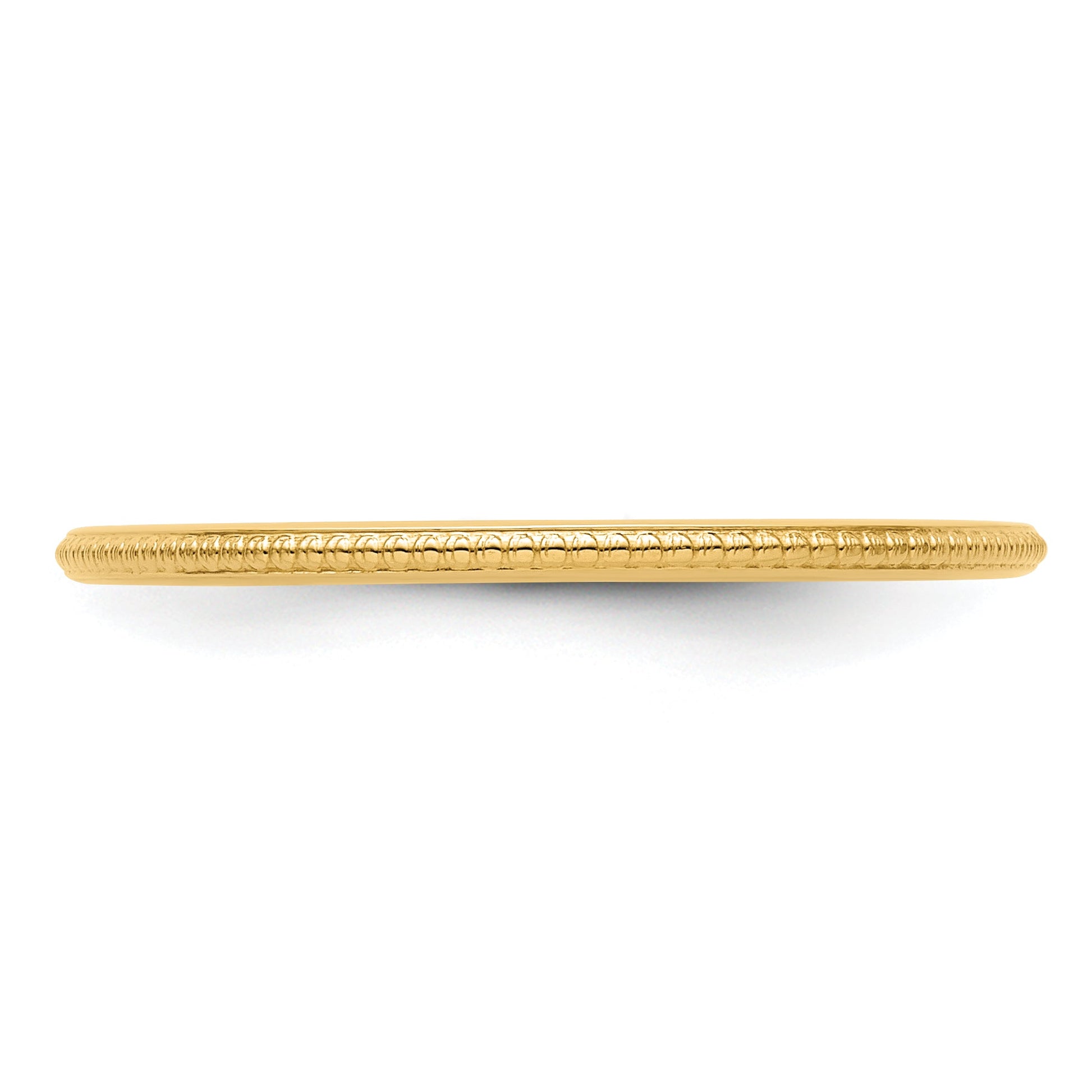 The 10K Yellow Gold 1.2mm Beaded Stackable Band exudes simple elegance and versatile charm. Forged from pure 10K gold, this ring boasts a refined polished finish that catches the light beautifully. Its delicate texture, combined with a standard fit, makes it perfect for stacking or wearing solo. With a slim band width of 1.2mm, it proves both understated and classy. Available in a size 6 with easy adjustment, this band suits those who cherish timeless style. The 10K Yellow Gold 1.2mm Beaded Stackable Band is a chic addition to any jewelry collection.