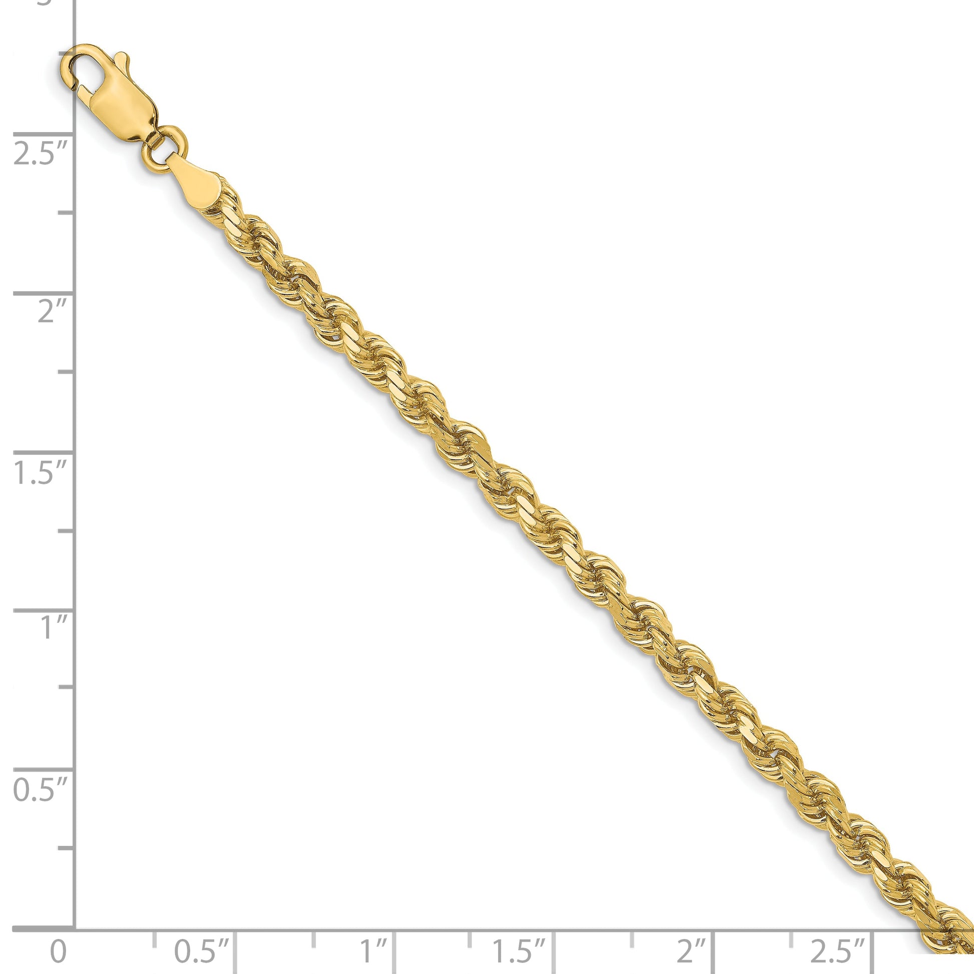 Discover the elegance of our 10K Yellow Gold 3.5mm Diamond-Cut Rope Chain Bracelet. This polished bracelet, featuring an 8-inch length, provides a timeless look with its diamond-cut design and solid, extruded structure. The 10K gold offers lasting shine and durability, while the lobster clasp ensures secure wear. Designed for both men and women, this unisex piece adds sophisticated flair to any outfit. The 3.5mm width offers the perfect balance of subtlety and presence. Elevate your style with the refined beauty of this 10K Yellow Gold 3.5mm Diamond-Cut Rope Chain Bracelet.
