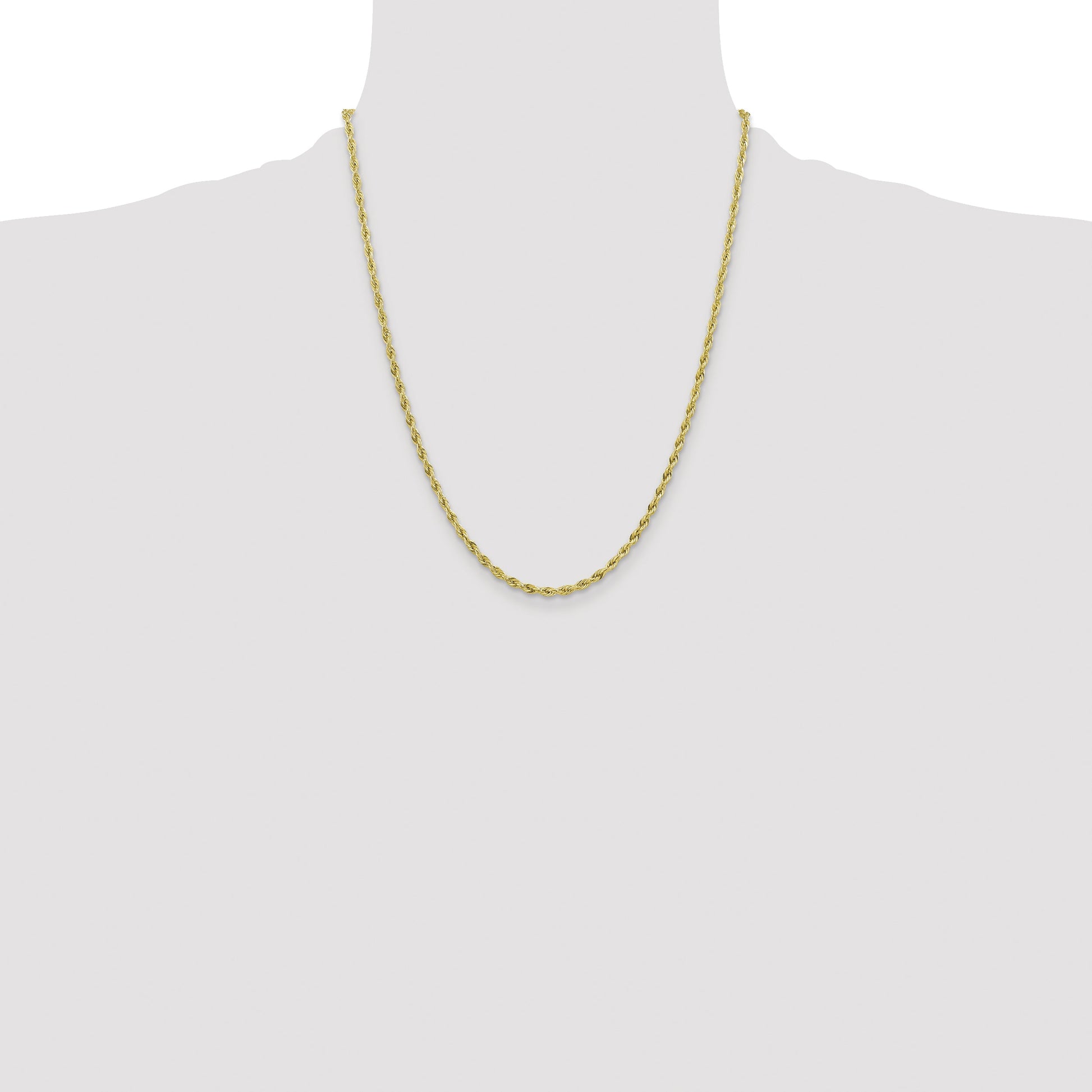 Introducing the 10k Yellow Gold 3mm Semi-Solid Rope Chain, a timeless piece that embodies both elegance and strength. Crafted with 10k pure yellow gold, this stunning chain shines with a polished finish, creating a radiant effect. Measuring 22 inches in length and 3mm in width, it features a sleek rope design that adds sophistication to any attire. The secure lobster clasp ensures your cherished accessory stays in place. Ideal for any occasion, the 10k Yellow Gold 3mm Semi-Solid Rope Chain is a must-have addition to your jewelry collection.