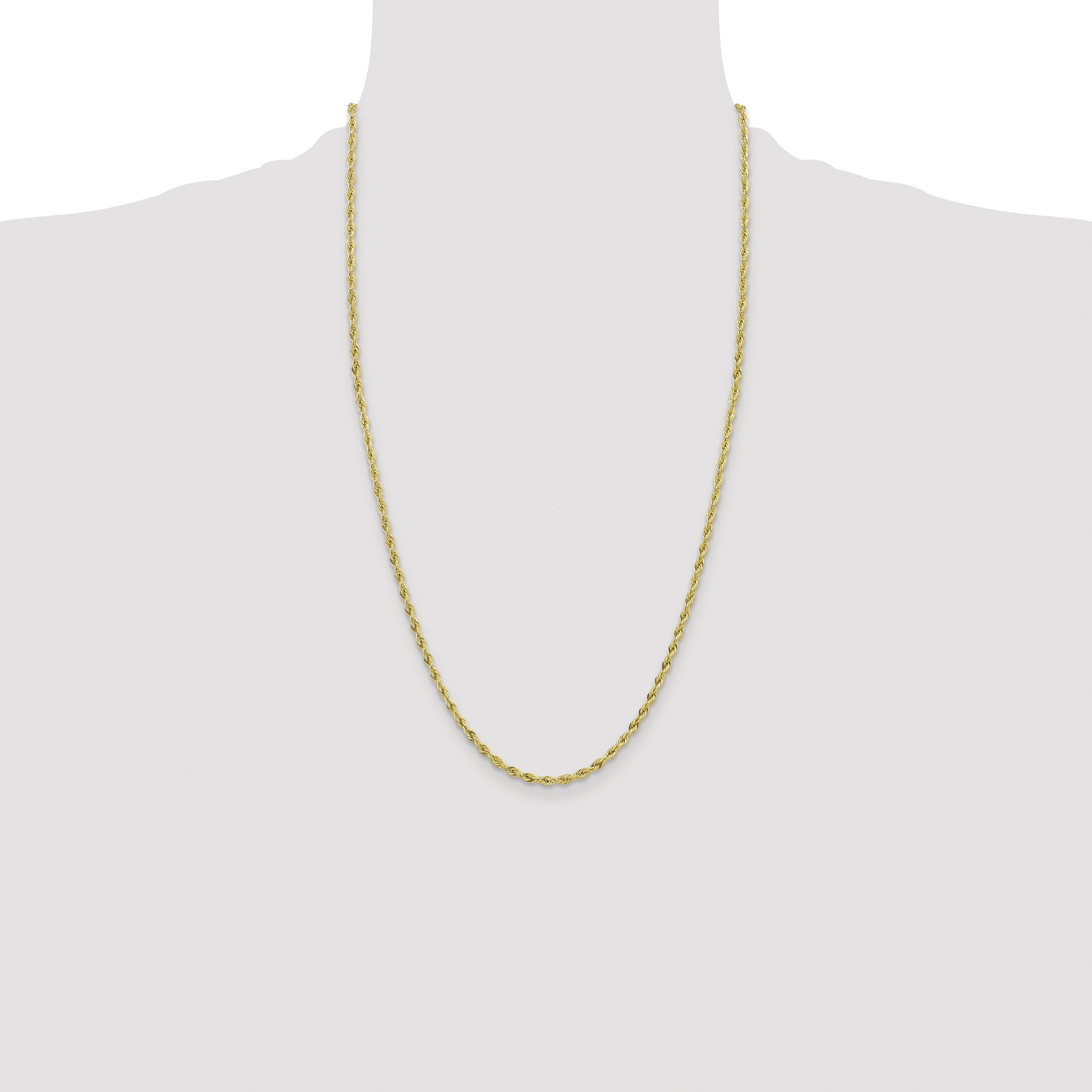 Introducing the 10k Yellow Gold 10k 3mm Semi-Solid Rope Chain, crafted to catch eyes and hearts alike. This polished 10k gold chain measures 26 inches in length and 3mm in width. Its sturdy, semi-solid rope design ensures lasting wear. The lobster clasp secures the piece while adding a sleek finish. Perfect for any outfit, this gold chain embodies elegance and resilience. The 10k Yellow Gold 10k 3mm Semi-Solid Rope Chain is a timeless addition to your jewelry collection.
