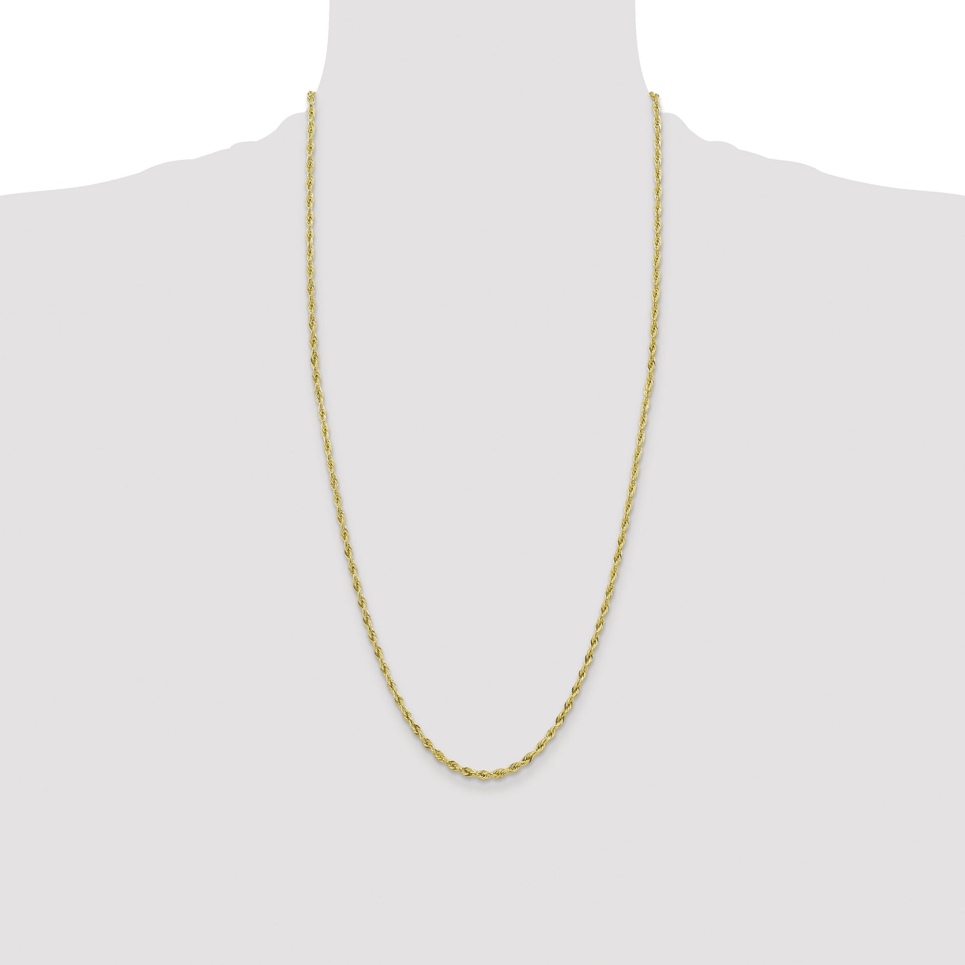 The 10k Yellow Gold 10k 3mm Semi-Solid Rope Chain blends elegance with durability. Crafted from polished 10k yellow gold, this 28-inch chain features a sturdy lobster clasp, ensuring secure wear. The rope design, 3mm in width, adds texture and depth, making it a versatile piece for any occasion. Semi-solid construction offers a lightweight yet robust feel. Elevate your jewelry collection with the timeless charm of this 10k Yellow Gold 10k 3mm Semi-Solid Rope Chain, perfect for both casual and formal settings.