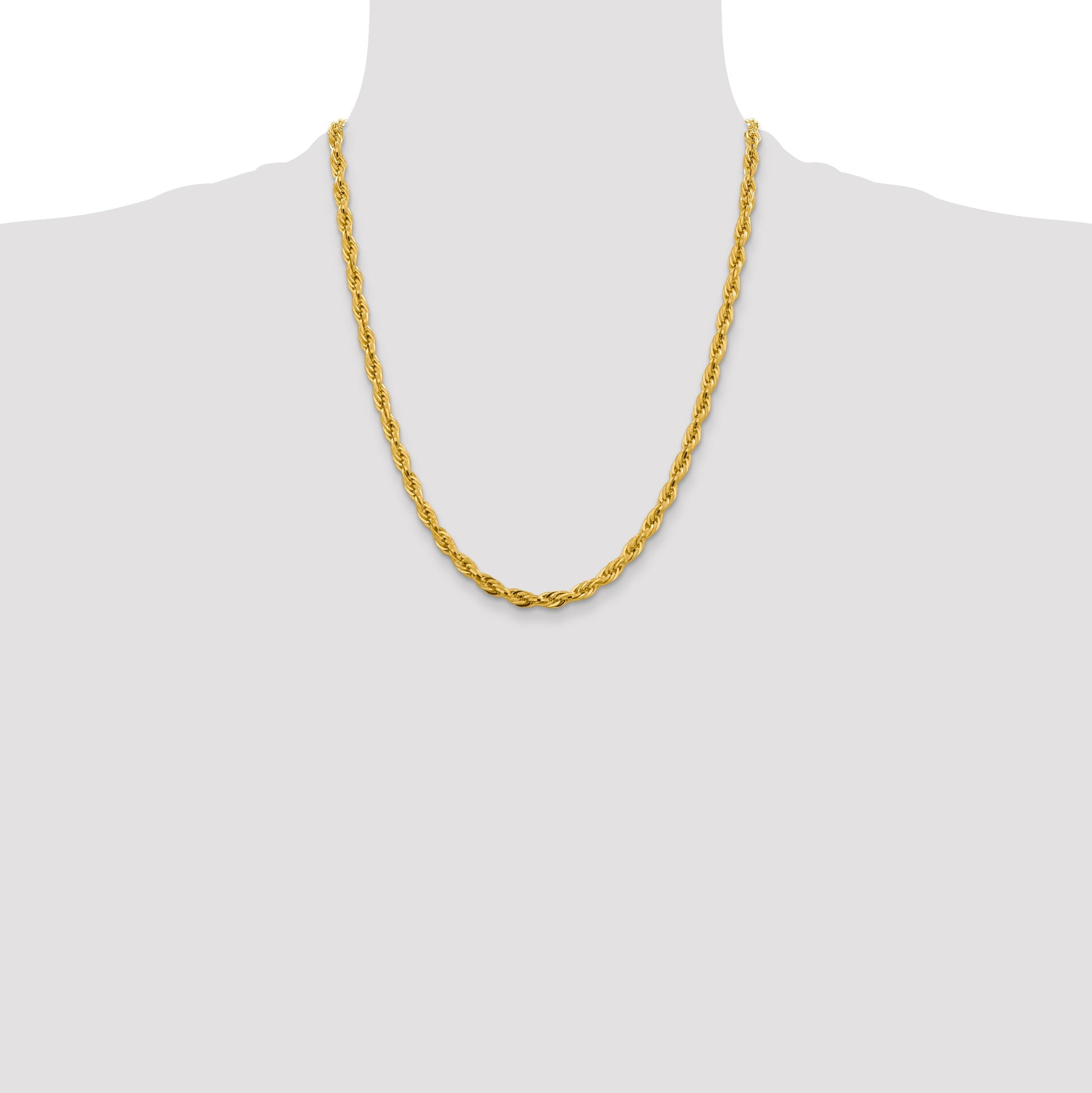 The 10k Yellow Gold 10k 4.75mm Semi-Solid Rope Chain exudes elegance and charm. Made from high-quality 10k gold, this polished necklace measures 22 inches, making it a perfect length for any occasion. The 4.75mm wide rope design offers a classic look while the semi-solid construction ensures durability without added weight. Its reliable lobster clasp adds convenience and security. Whether worn alone or paired with a pendant, the 10k Yellow Gold 10k 4.75mm Semi-Solid Rope Chain is a versatile and stylish addition to any jewelry collection.