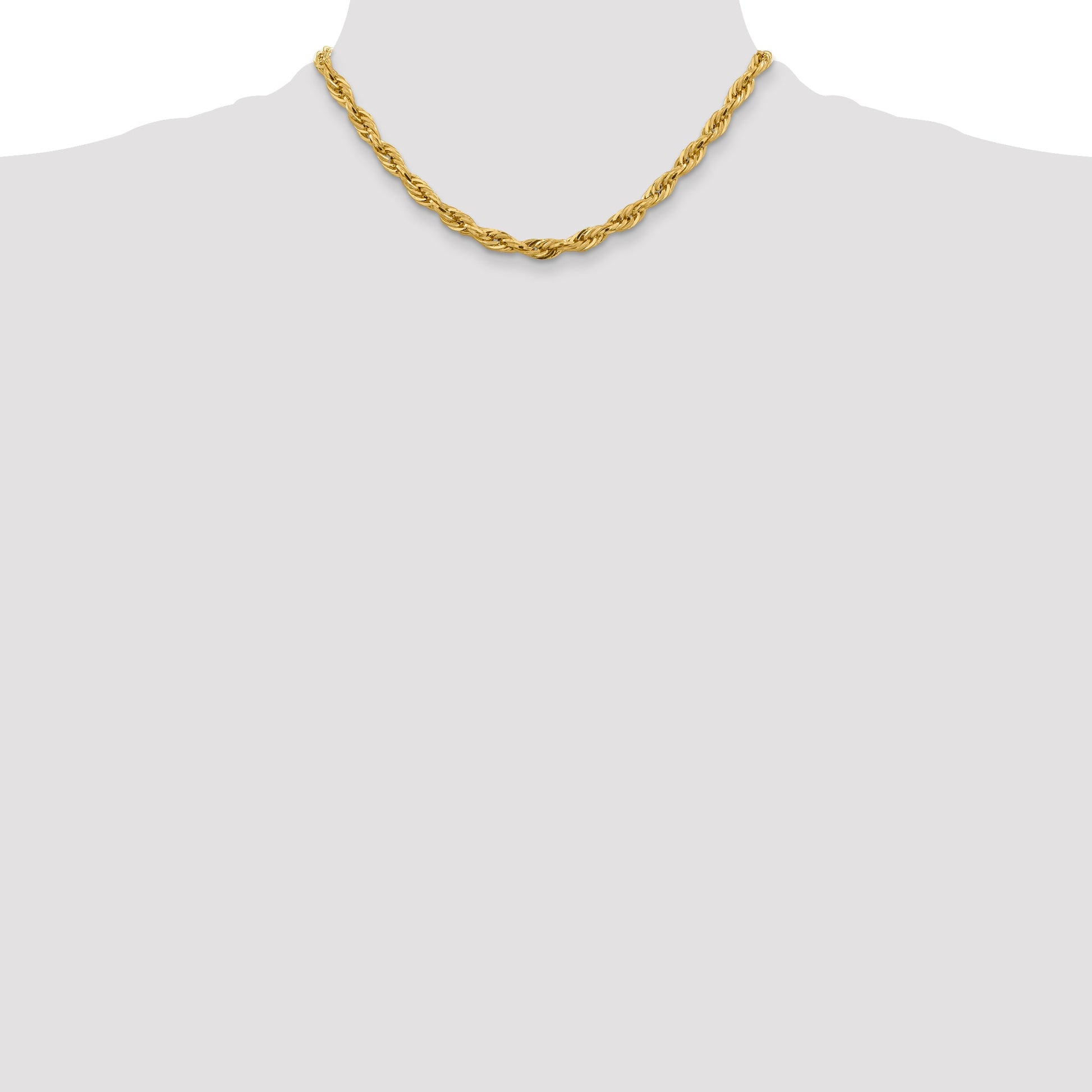 Discover the timeless elegance of our 10k Yellow Gold 5.4mm Semi-Solid Rope Chain. Crafted from pure 10k gold, this polished necklace shines with a warm yellow hue. Measuring 16 inches, this piece falls perfectly around the neck, adding a touch of sophistication to any look. The 5.4mm width and sturdy lobster clasp ensure durability and a secure fit. This semi-solid rope chain necklace is a versatile and elegant addition to your jewelry collection. Embrace the beauty and strength of 10k Yellow Gold with this exquisite piece.