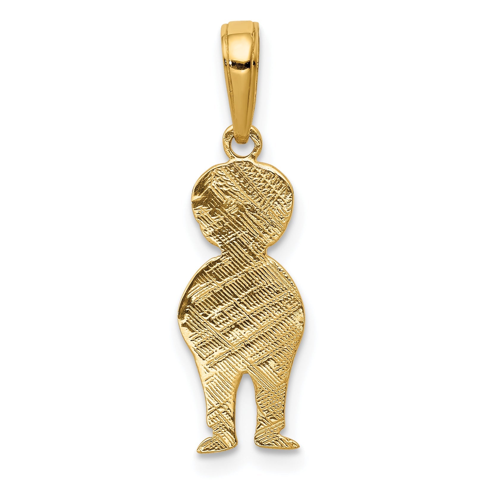 The 10K Yellow Gold Boy With Hands In Pocket Pendant exudes timeless charm. Crafted from genuine 10K yellow gold, it boasts a polished finish for that radiant shine. With its compact dimensions of 23mm in length and 8mm in width, this pendant is the perfect addition to any jewelry collection. The solid, casted design highlights the fine craftsmanship, ensuring lasting quality. This whimsical boy-themed pendant captures a youthful spirit, making it a delightful piece to wear or gift. Experience the elegance of the 10K Yellow Gold Boy With Hands In Pocket Pendant today.