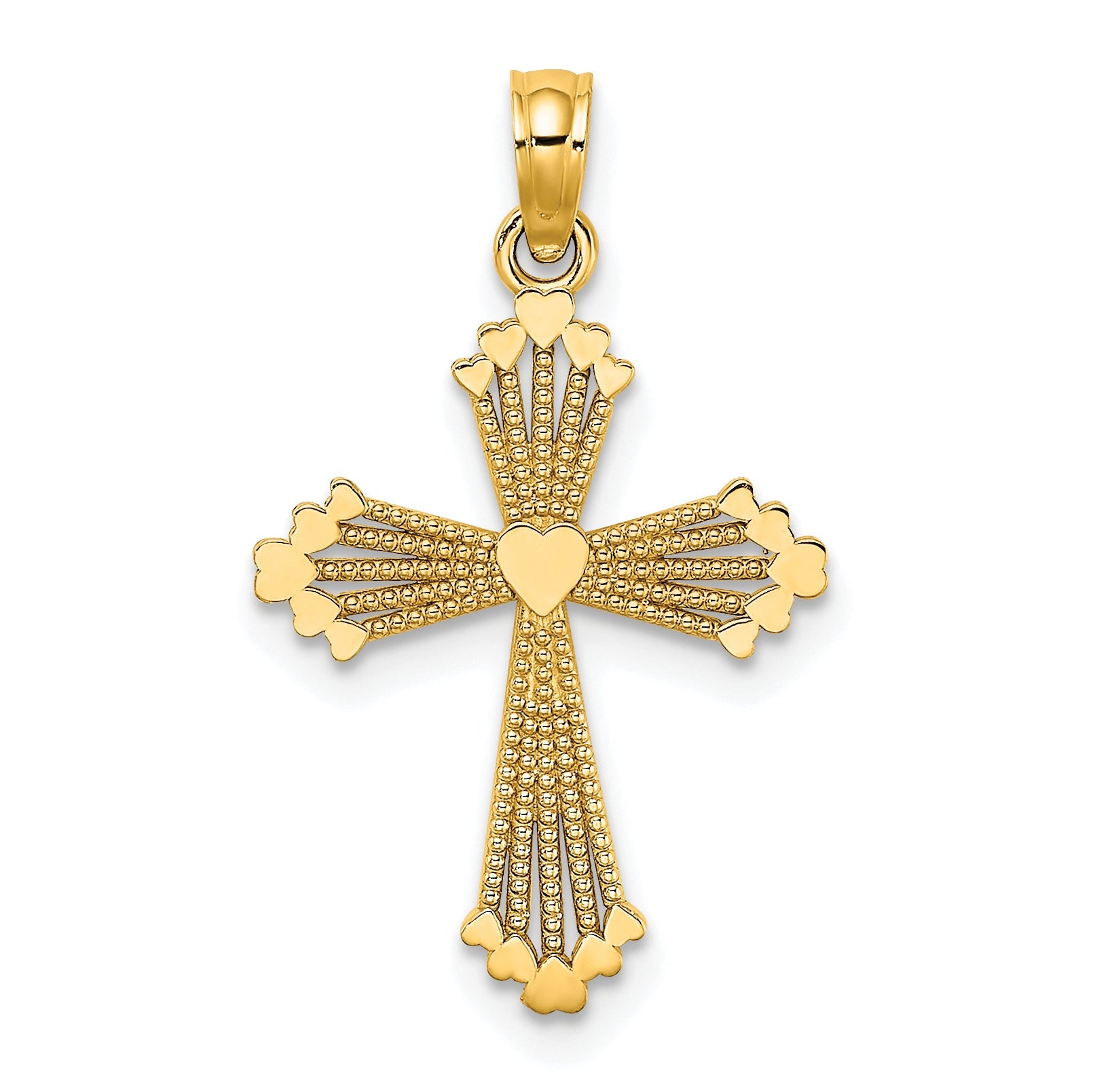 Embrace elegance with the 10K Yellow Gold Cut-Out Stripes Cross with Heart Charm. Made from luxe 10K gold, this piece boasts a polished finish that catches the light beautifully. The charm features intricate cut-out stripes and a heart, adding a unique and heartfelt touch. Measuring 24.55 mm in length and 14.5 mm in width, this solid pendant is casted for durability and timeless style. Whether worn alone or layered, the 10K Yellow Gold Cut-Out Stripes Cross with Heart Charm adds sophistication to any outfit.