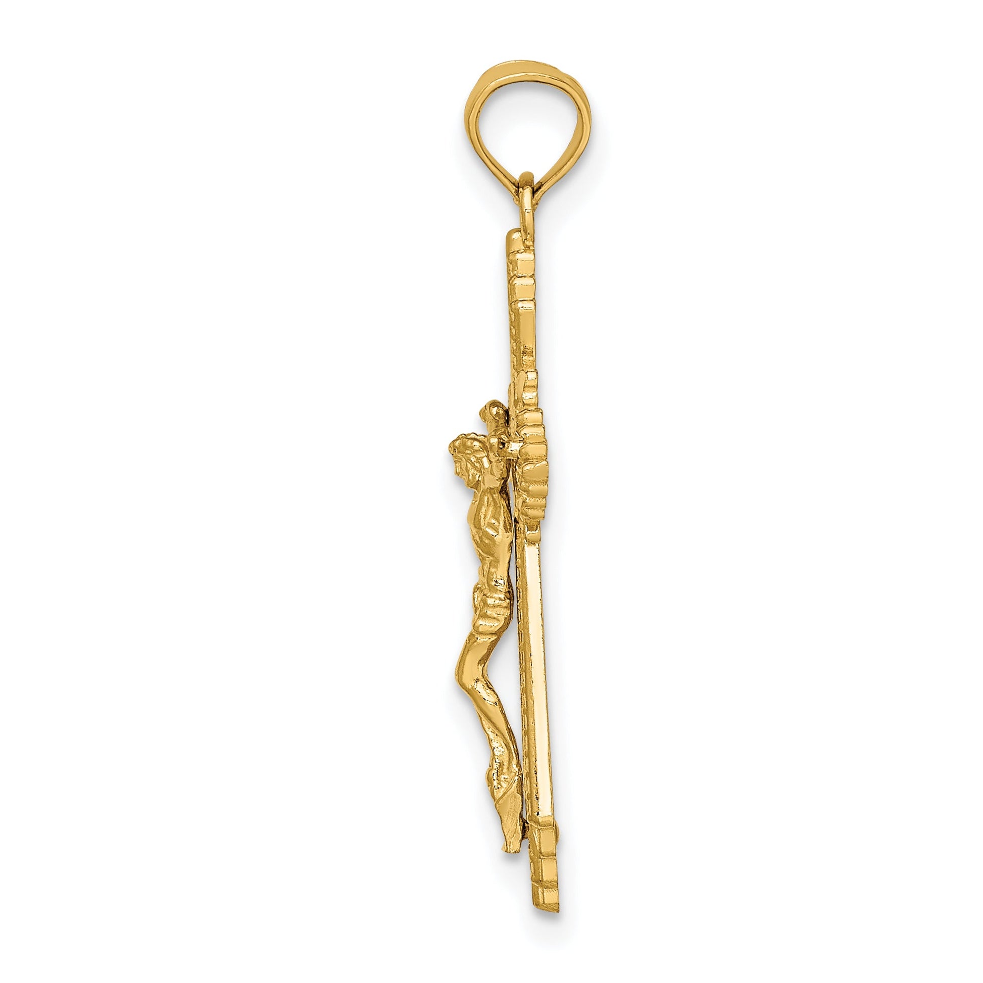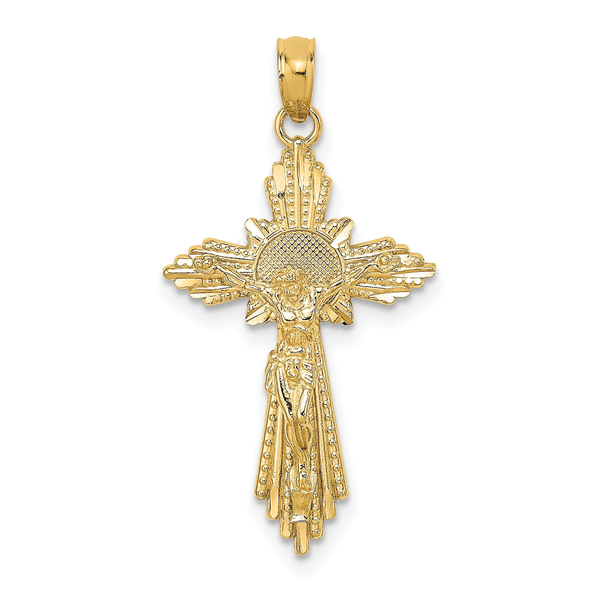 The 10K Yellow Gold 10K D/C Crucifix Charm boasts a classic appeal crafted for those with an appreciation for fine jewelry. This crucifix charm, made from solid 10K yellow gold, gleams with a polished finish. Measuring 31.4 mm in length, it features a detailed design, perfect for pendants or charms lovers. The charm's casting process ensures durability, making it a timeless piece in your collection. With a bail width of 5 mm and length of 7 mm, it fits snugly on chains. Elevate any attire with the 10K Yellow Gold 10K D/C Crucifix Charm.