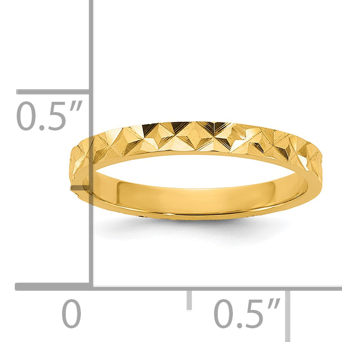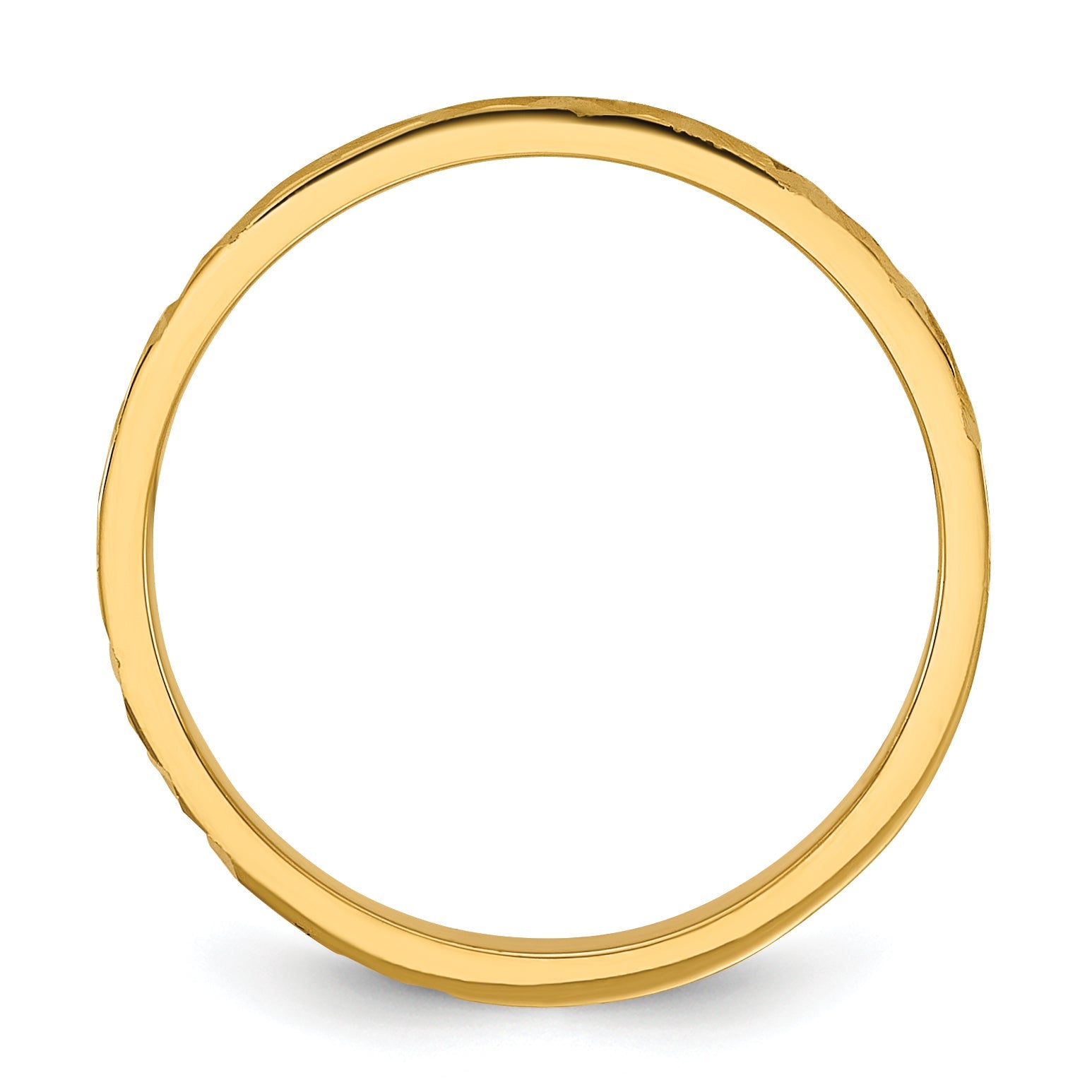 The 10K Yellow Gold 10K Diamond-Cut Design 2mm Flat Band for babies and kids is an exquisite piece of jewelry. Crafted from 10K yellow gold, its polished finish shines brilliantly, making it a charming accessory for the little ones. The delicate 2mm band width is perfect for tiny fingers, while the diamond-cut texture adds an elegant touch. Designed with a flat profile, it ensures comfort and style. This children's ring is both durable and fashionable, ideal for special occasions or daily wear. Choose this beautiful 10K Yellow Gold ring for a touch of timeless elegance.