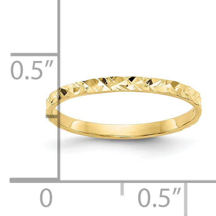 This adorable 10K Yellow Gold Diamond-Cut Design Band Child's Ring captures hearts with its simple elegance. Created from lustrous 10K gold, the diamond-cut design adds a touch of sparkle to this petite piece, making it perfect for little fingers. Its polished finish provides a smooth, shiny surface that gleams in the light, capturing the youthful spirit of your child. Ideal for gifting or marking a special occasion, this ring offers a precious way to cherish moments. Discover the wonder of this 10K Yellow Gold Diamond-Cut Design Band Child's Ring and make cherished memories.