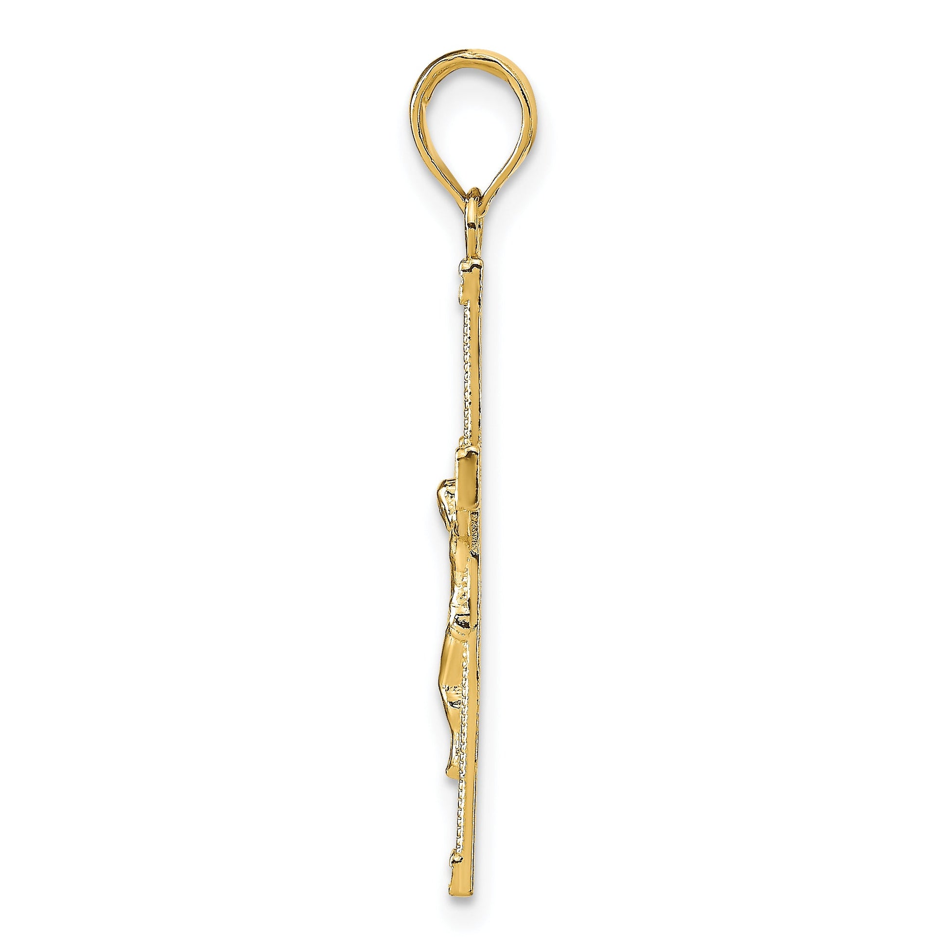 The 10K Yellow Gold 10K Diamond-Cut Fancy Tipped Crucifix Pendant is a stunning piece that captures the eye. Crafted from solid 10K yellow gold, this pendant features a polished finish, giving it a brilliant shine. Its diamond-cut detail adds a touch of elegance and sophistication. Measuring 33mm in length, it sits beautifully around the neck, with the pendant itself measuring 27.71mm long and 16.46mm wide. This crucifix pendant showcases meticulous craftsmanship resulting from a precise casting process. Wear this pendant as a symbol of faith or simply as a stylish accessory, embodying both beauty and meaning. The 10K Yellow Gold 10K Diamond-Cut Fancy Tipped Crucifix Pendant makes a treasured addition to any jewelry collection.