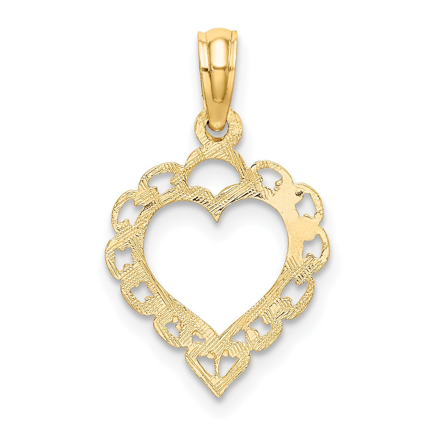 Introducing the dazzling 10K Yellow Gold Heart with Lace Trim Charm, a perfect blend of elegance and charm. A finely polished gem in solid 10K yellow gold, this ornament boasts a lace-trimmed heart design. Measuring 15.38 mm in length and 12 mm in width, it's the ideal pendant to wear close to your heart for any occasion. Its golden hue adds warmth and sophistication to any look. Elevate your jewelry collection with this themed charm, a unique piece that exudes timeless beauty. The 10K Yellow Gold Heart with Lace Trim Charm is a treasure to cherish.