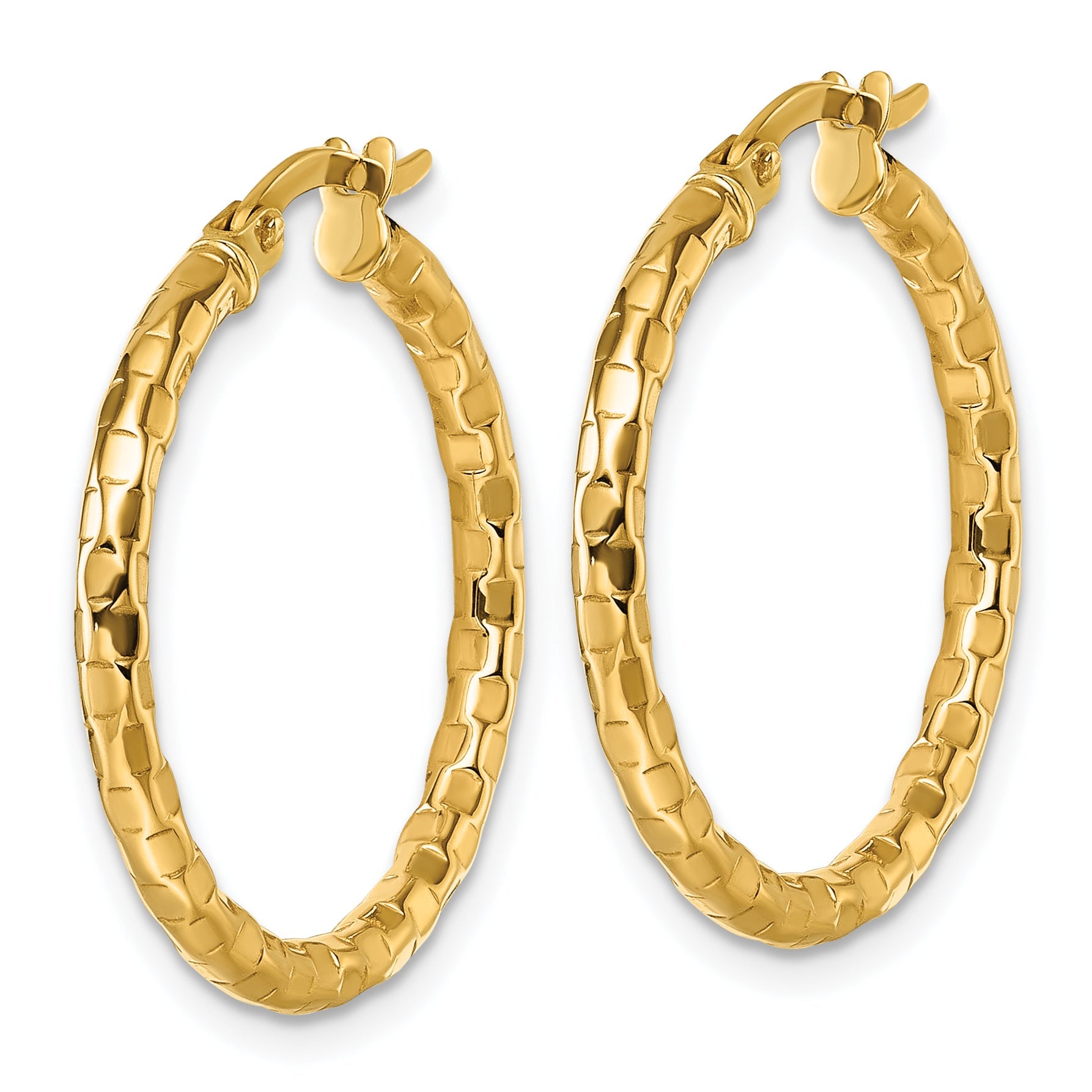 Introducing the stunning 10K Yellow Gold Polished and Textured Tube Hoop Earrings. Crafted from high-quality 10K gold, these earrings offer a perfect blend of elegance and style. Measuring 24mm in width, they feature a beautiful diamond-cut texture that adds a unique sparkle to any outfit. The 2.5mm thick hoops are both lightweight and durable, making them perfect for daily wear. Their polished finish enhances their golden glow, while the wire and clutch closure ensures a secure fit. Elevate any look with these gorgeous 10K Yellow Gold Polished and Textured Tube Hoop Earrings.