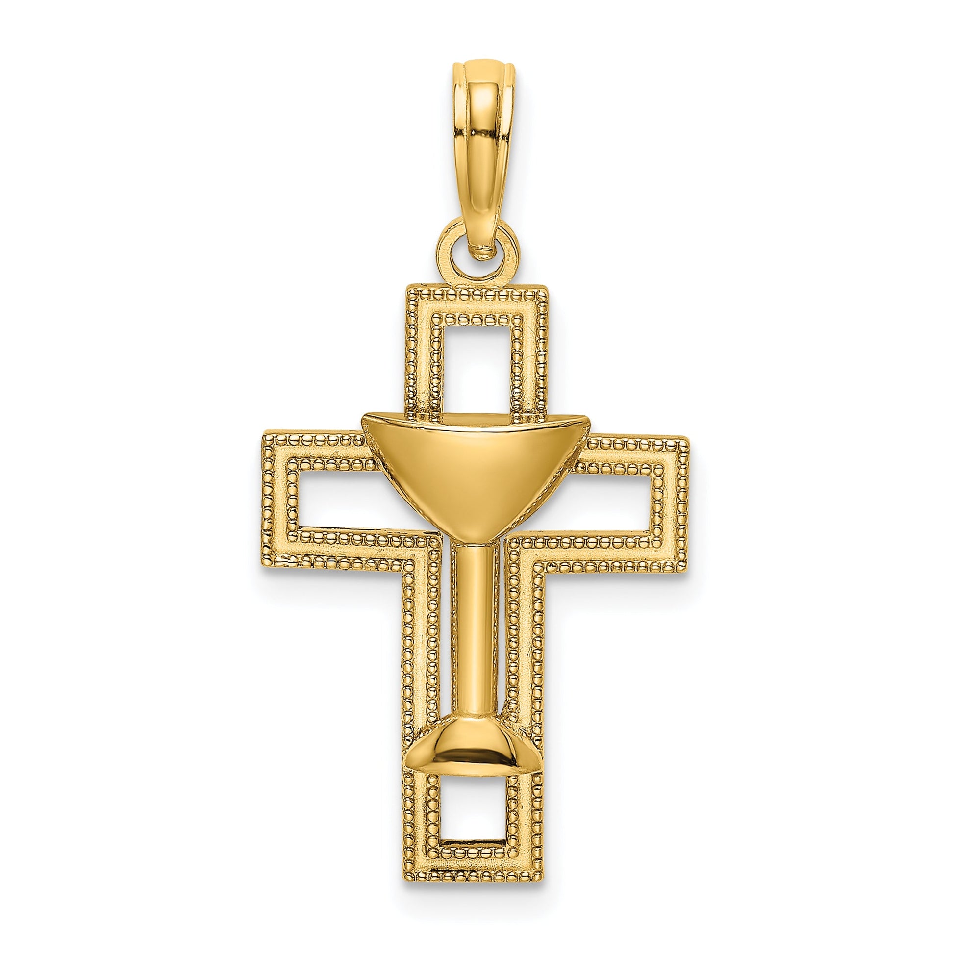 Discover timeless elegance with our 10K Yellow Gold Polished Cross with Communion Cup Charm. This exquisite piece, crafted from pure 10K gold, boasts a sleek, polished finish that captures light beautifully. Measuring 25.2 mm in length and 14 mm in width, this solid, casted charm offers a perfect blend of classic design with a modern twist. The detailed communion cup adds a touch of uniqueness, making it a meaningful piece to cherish. Elevate your collection with this thoughtful addition. Elevate your style with our 10K Yellow Gold Polished Cross with Communion Cup Charm. Perfect for any occasion.