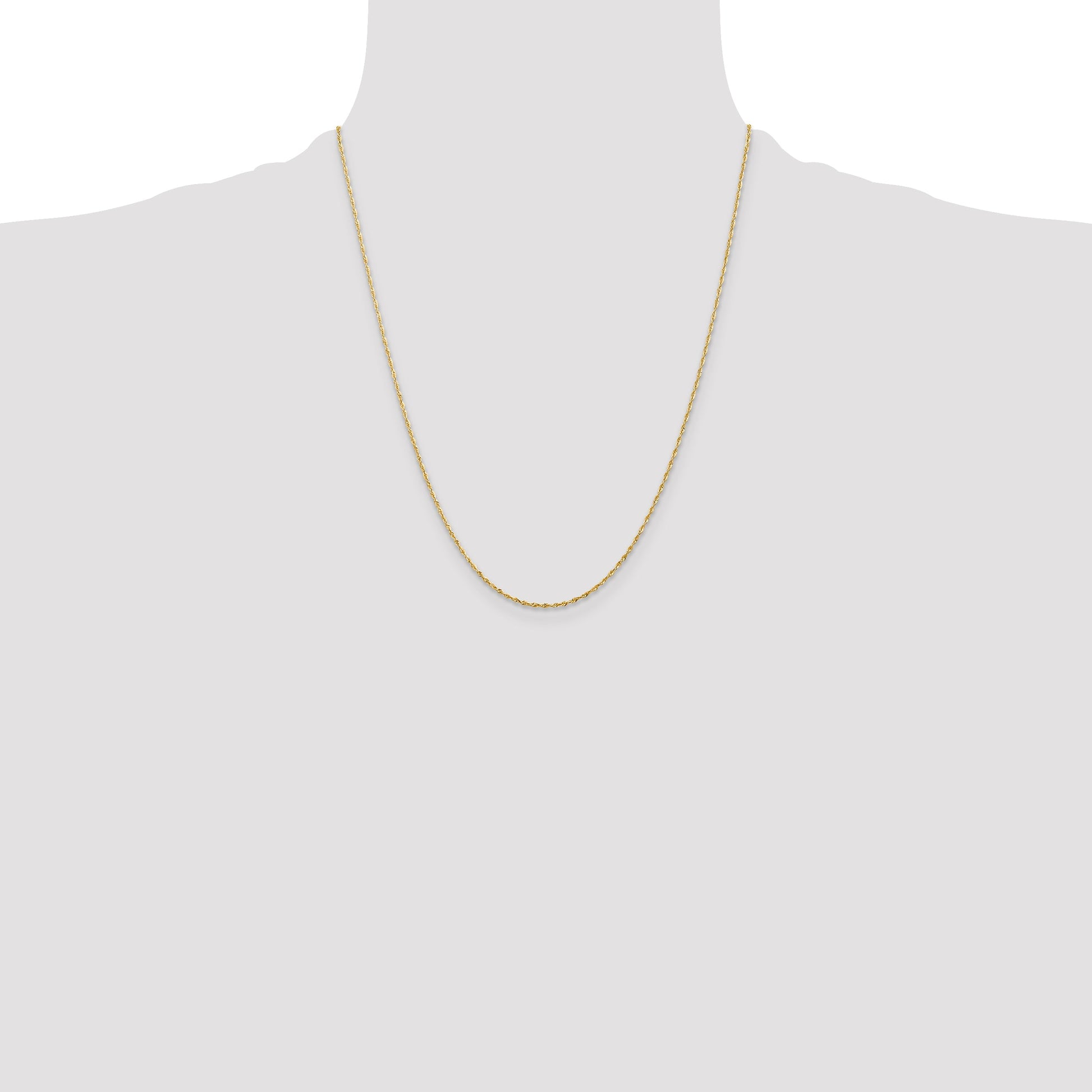 The 10K Yellow Gold 1.5mm Diamond-Cut Lightweight Rope Chain is a sleek, stylish addition to any jewelry collection. Crafted from pure 10K gold, this chain shines with a polished finish and features a diamond-cut design that adds extra sparkle. At 22 inches long, it offers a comfortable fit for both men and women. The lightweight build makes it easy to wear all day, while the solid rope style delivers a classic look. With a durable lobster clasp, the 10K Yellow Gold 1.5mm Diamond-Cut Lightweight Rope Chain is perfect to wear alone or layered with other pieces.