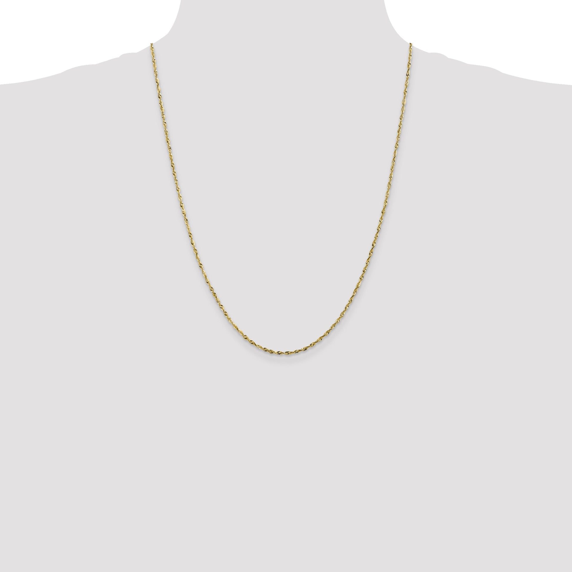 The 10K Yellow Gold 10K 1.8mm Diamond-Cut Lightweight Rope Chain is a sleek piece that adds a touch of shine to any look. Crafted from solid 10K gold, it features a diamond-cut finish that catches the light beautifully. The chain measures 24 inches long and is just 1.8mm wide, making it lightweight and comfortable for everyday wear. Its durable lobster clasp ensures a secure fit. Perfect for both men and women, this necklace offers style and quality with a lifetime guarantee. The 10K Yellow Gold 10K 1.8mm Diamond-Cut Lightweight Rope Chain is a versatile addition to any jewelry collection.