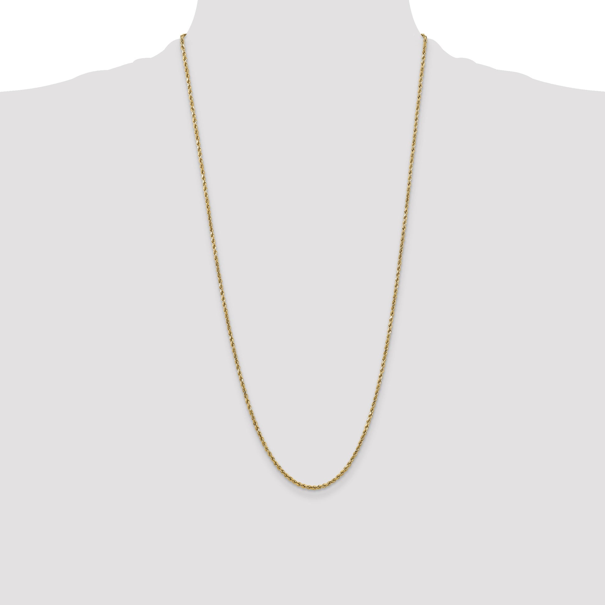 The 10K Yellow Gold 2.5mm Semi-Solid D/C Rope Chain is a stunning piece that adds a touch of elegance to any outfit. Crafted from 10K gold, this chain radiates a rich yellow hue, exuding timeless charm. With its 28-inch length and 2.5mm width, this chain offers a balanced combination of slenderness and presence. Its durable, semi-solid construction ensures strength while maintaining a sophisticated look. Finished with a lobster clasp, the chain stays securely in place. Elevate your style with the 10K Yellow Gold 2.5mm Semi-Solid D/C Rope Chain, perfect for everyday wear or special occasions.