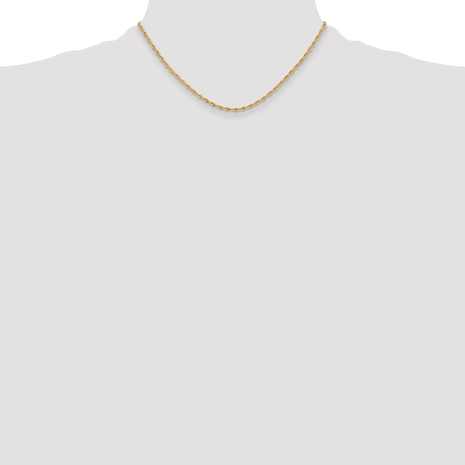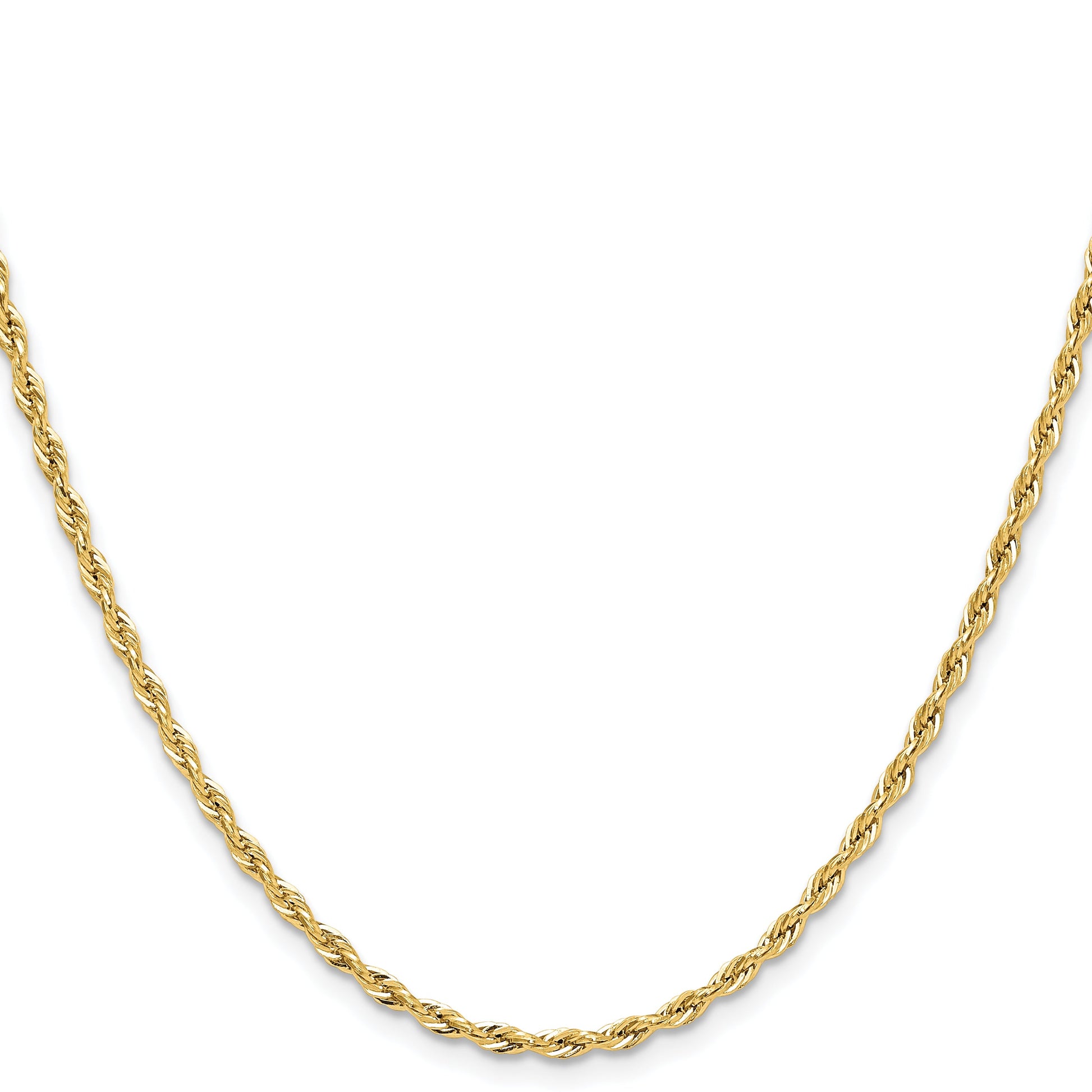The 10K Yellow Gold 2.5mm Semi-Solid Rope Chain embodies timeless style and elegance. Crafted with 10K gold, its radiant yellow color luster stands out, adding a classic touch to any outfit. This 16-inch necklace features a durable rope design, providing both a sturdy feel and an intricate, eye-catching look. The 2.5mm width offers just the right balance between subtlety and presence. A secure lobster clasp ensures easy wear and removal. With its exquisite finish, the 10K Yellow Gold 2.5mm Semi-Solid Rope Chain is an ideal accessory for both daily wear and special occasions, ensuring you shine bright.