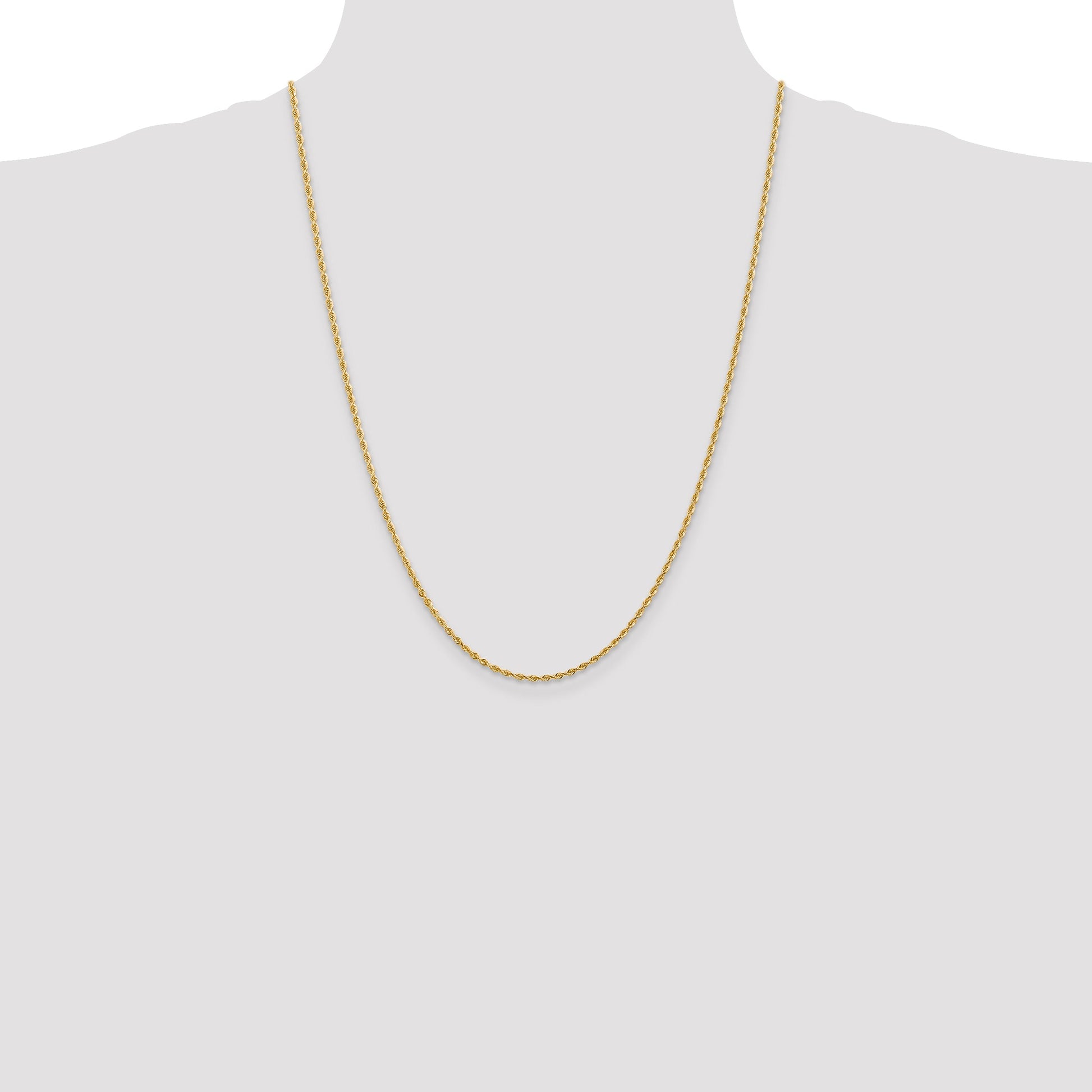 Introducing the stunning 10K Yellow Gold 2mm D/C Quadruple Rope Chain, a perfect blend of elegance and strength. Crafted with polished, high-quality 10K gold, this necklace showcases a diamond-cut texture that catches the light beautifully. Its 24-inch length drapes gracefully around the neck, while the solid, 2mm width offers a bold presence. The rope chain design is both classic and versatile, making it an ideal addition to any jewelry collection. Secured with a sturdy lobster clasp, the 10K Yellow Gold 2mm D/C Quadruple Rope Chain promises both style and reliability.