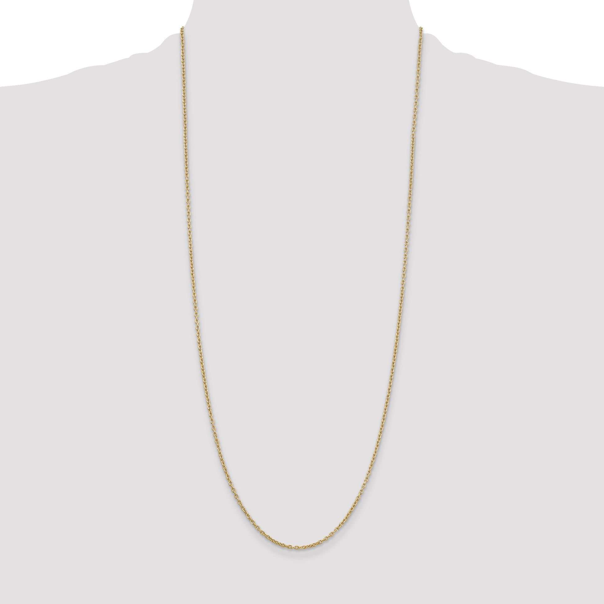 The 10K Yellow Gold 2mm Round Open Link Cable Chain is a shining example of elegance and simplicity. Crafted from pure 10K gold, its rich yellow glow captures the eye. With a generous 30-inch length, this cable chain drapes gracefully, showcasing its delicate 2mm width. The lobster clasp ensures a secure fit while maintaining style. It's the perfect addition for any outfit, whether layered or worn solo. Elevate your jewelry collection with the timeless allure of the 10K Yellow Gold 2mm Round Open Link Cable Chain.