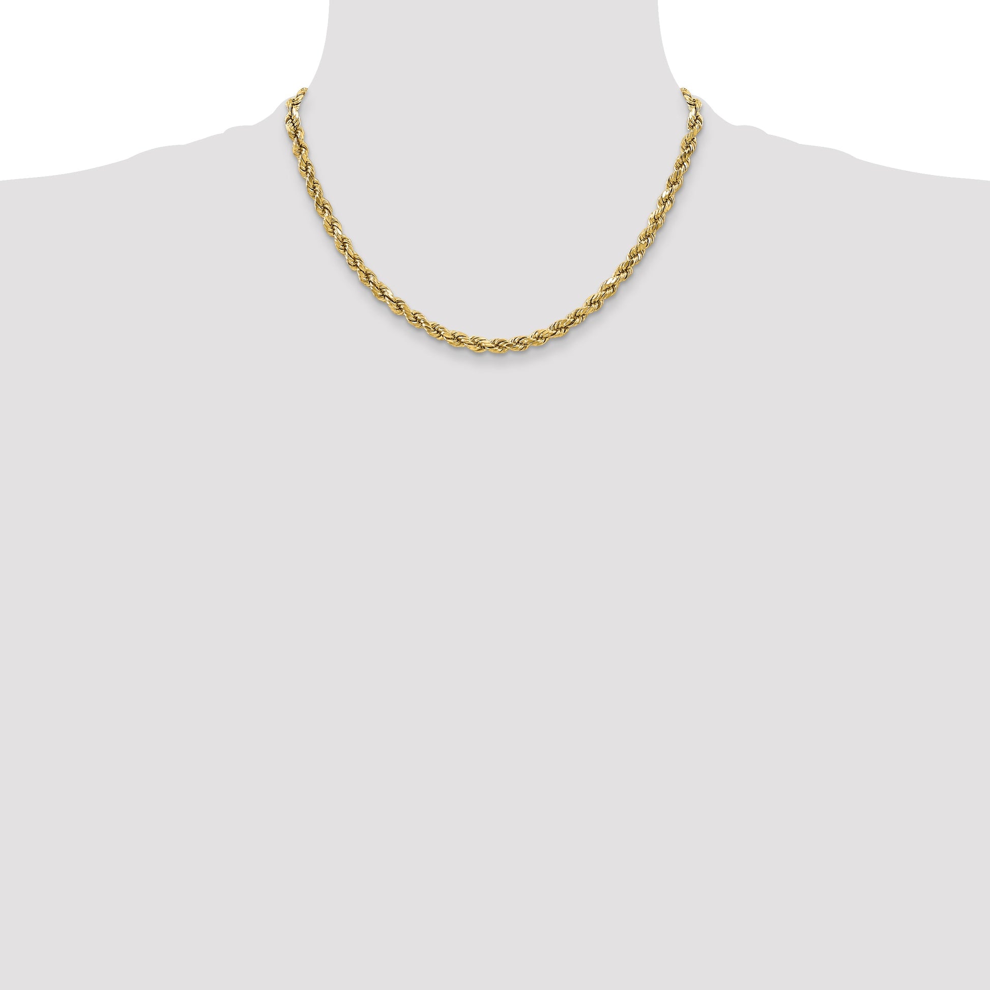 The 10K Yellow Gold 3.5mm Semi-Solid D/C Rope Chain is a fine piece of jewelry that adds elegance to any outfit. Crafted with 10K polished yellow gold, this 18-inch chain is designed with a sturdy lobster claw clasp. Its 3.5mm diamond-cut rope style gives it a shining, textured look that catches the light beautifully. The semi-solid design provides both durability and a luxurious feel. Ideal for daily wear or special occasions, the 10K Yellow Gold 3.5mm Semi-Solid D/C Rope Chain is a timeless accessory that complements any neckline.