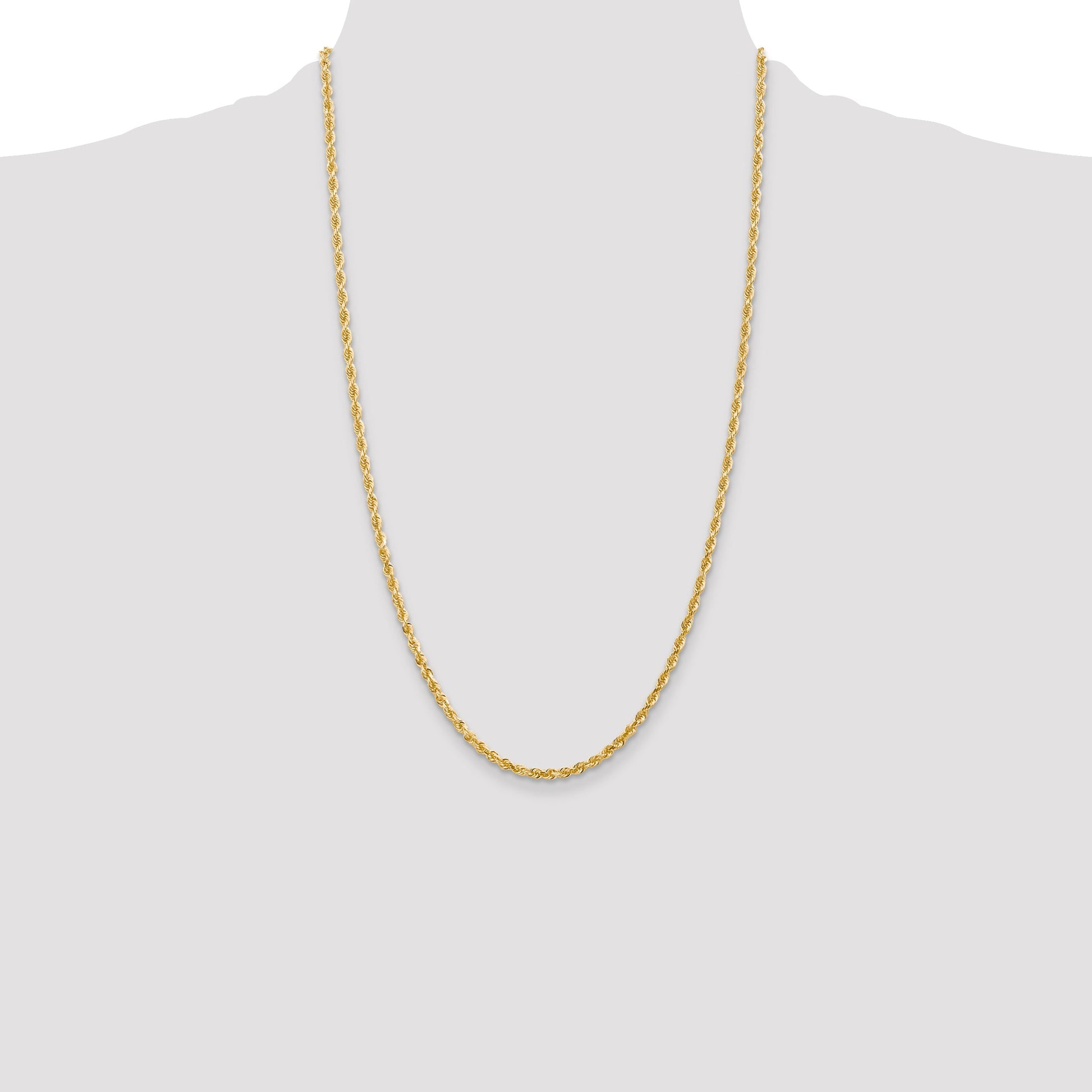 Introducing the 10K Yellow Gold 3mm D/C Quadruple Rope Chain—an emblem of elegance and craftsmanship. Ideal for both men and women, its 26-inch length ensures a perfect fit. Crafted from 10K yellow gold, its polished finish shines splendidly. The 3mm diamond-cut texture enhances its visual appeal, offering a unique shimmer. This solid rope chain features a lobster clasp for secure wear, and its vibrant yellow hue adds a touch of luxury to any outfit. Elevate your jewelry collection with the 10K Yellow Gold 3mm D/C Quadruple Rope Chain.