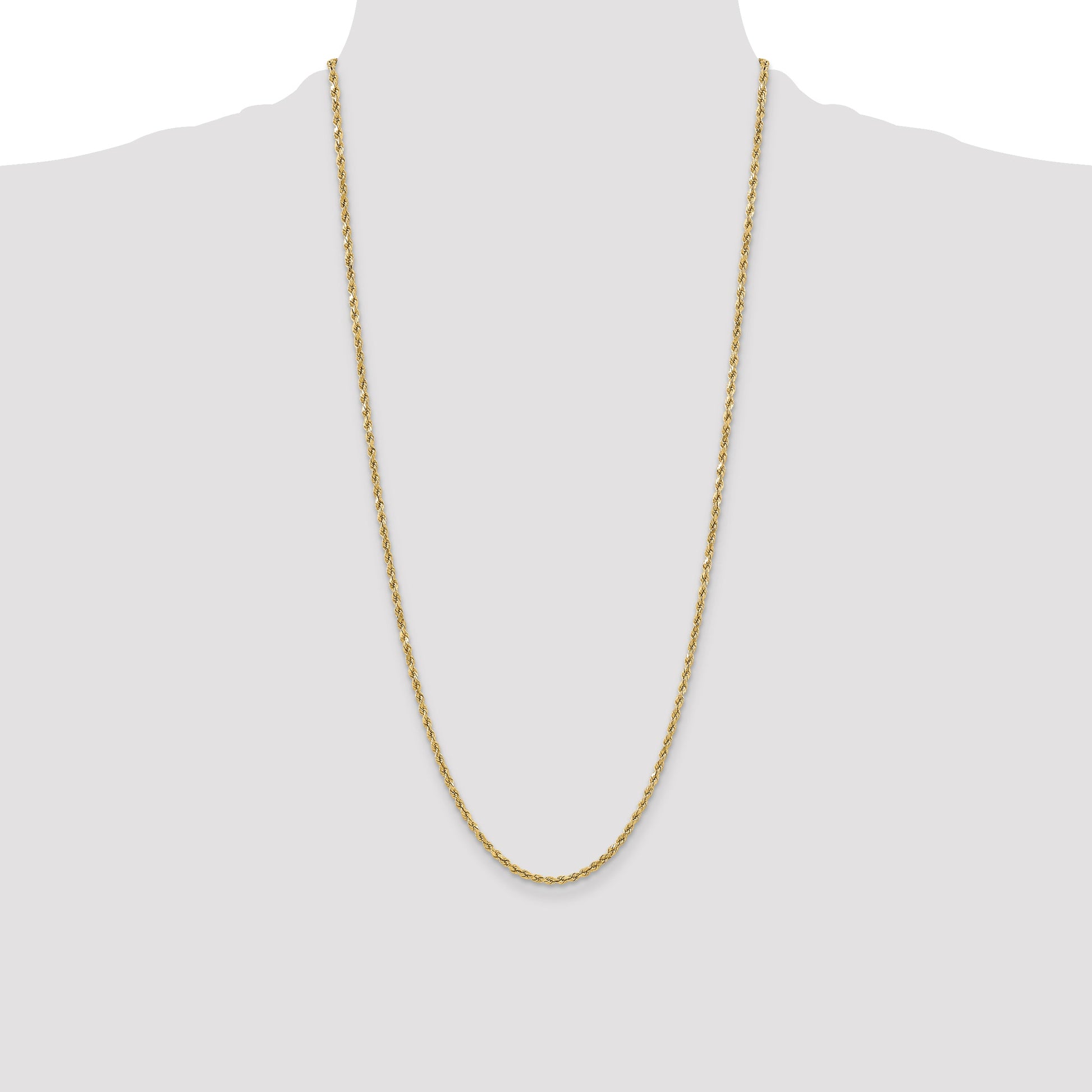 Get ready to dazzle with the 10K Yellow Gold 3mm Semi-Solid D/C Rope Chain. This stunning piece blends classic elegance with modern style, crafted with luminous 10K yellow gold. The rope chain design offers a timeless twist pattern, giving it a captivating appeal. It stretches to a chic 28 inches, providing versatility for any neckline or outfit. With its 3mm width and reliable lobster clasp, this chain assures durability and security. Elevate your style effortlessly with the 10K Yellow Gold 3mm Semi-Solid D/C Rope Chain and leave a lasting impression.