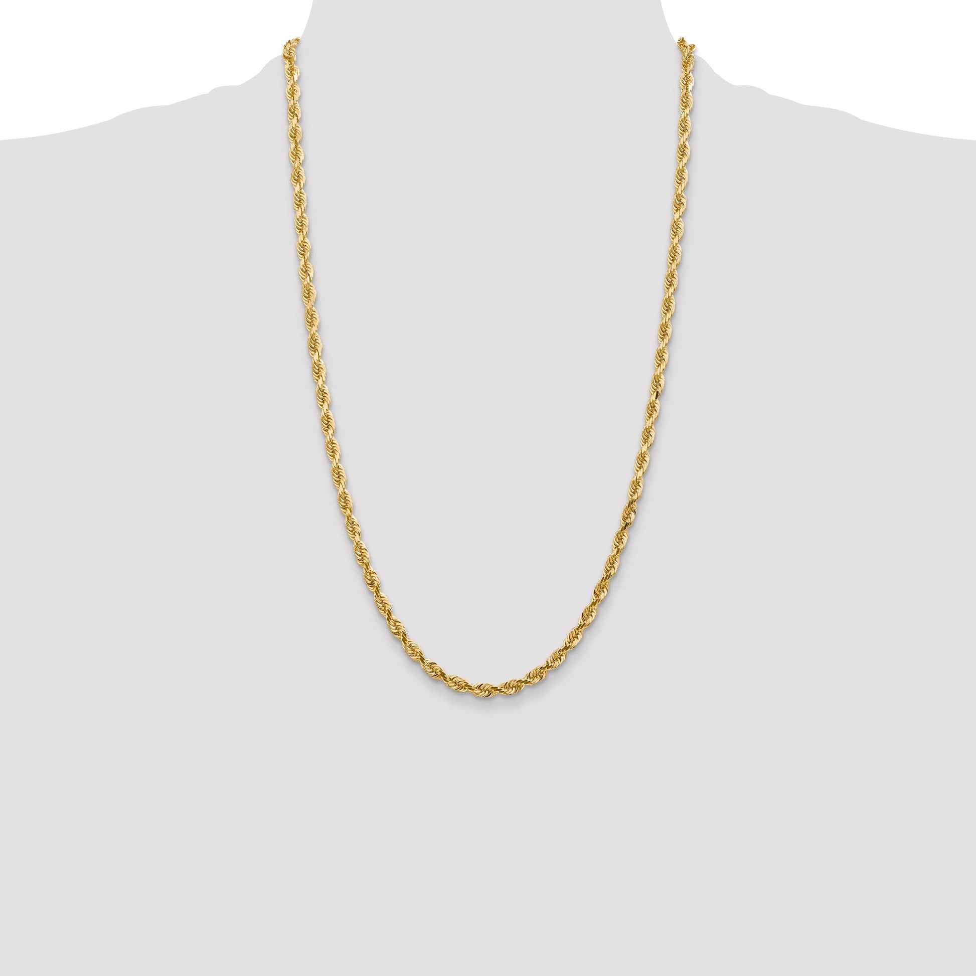 The 10K Yellow Gold 4.5mm D/C Quadruple Rope Chain blends sleek design with durability. Crafted from polished 10K yellow gold, this standout piece glistens with a diamond-cut texture, adding a subtle sparkle to any ensemble. The chain, measuring a generous 26 inches and 4.5 mm wide, is versatile for any occasion. Its robust lobster clasp ensures secure wear. Ideal for both men and women, this solid, unisex necklace captures timeless elegance. Elevate your style effortlessly with the 10K Yellow Gold 4.5mm D/C Quadruple Rope Chain.