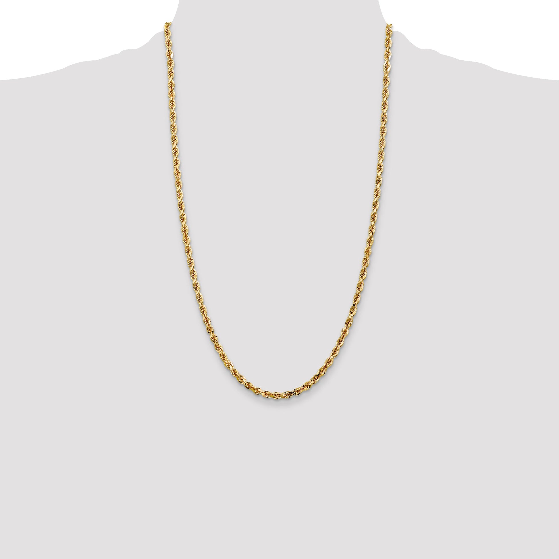 Introducing the 10K Yellow Gold 4mm D/C Quadruple Rope Chain—where luxury meets timeless design. Crafted with polished 10K gold, this 26-inch chain boasts a striking rope style that's 4mm wide. Its diamond-cut texture enhances its brilliance and catches the light perfectly. Durable and solid, it includes a secure lobster clasp, ensuring it stays put around your neck. This unisex necklace offers versatility suitable for any occasion, elevating both casual and formal attire with ease. Display elegance and style every day with the 10K Yellow Gold 4mm D/C Quadruple Rope Chain.