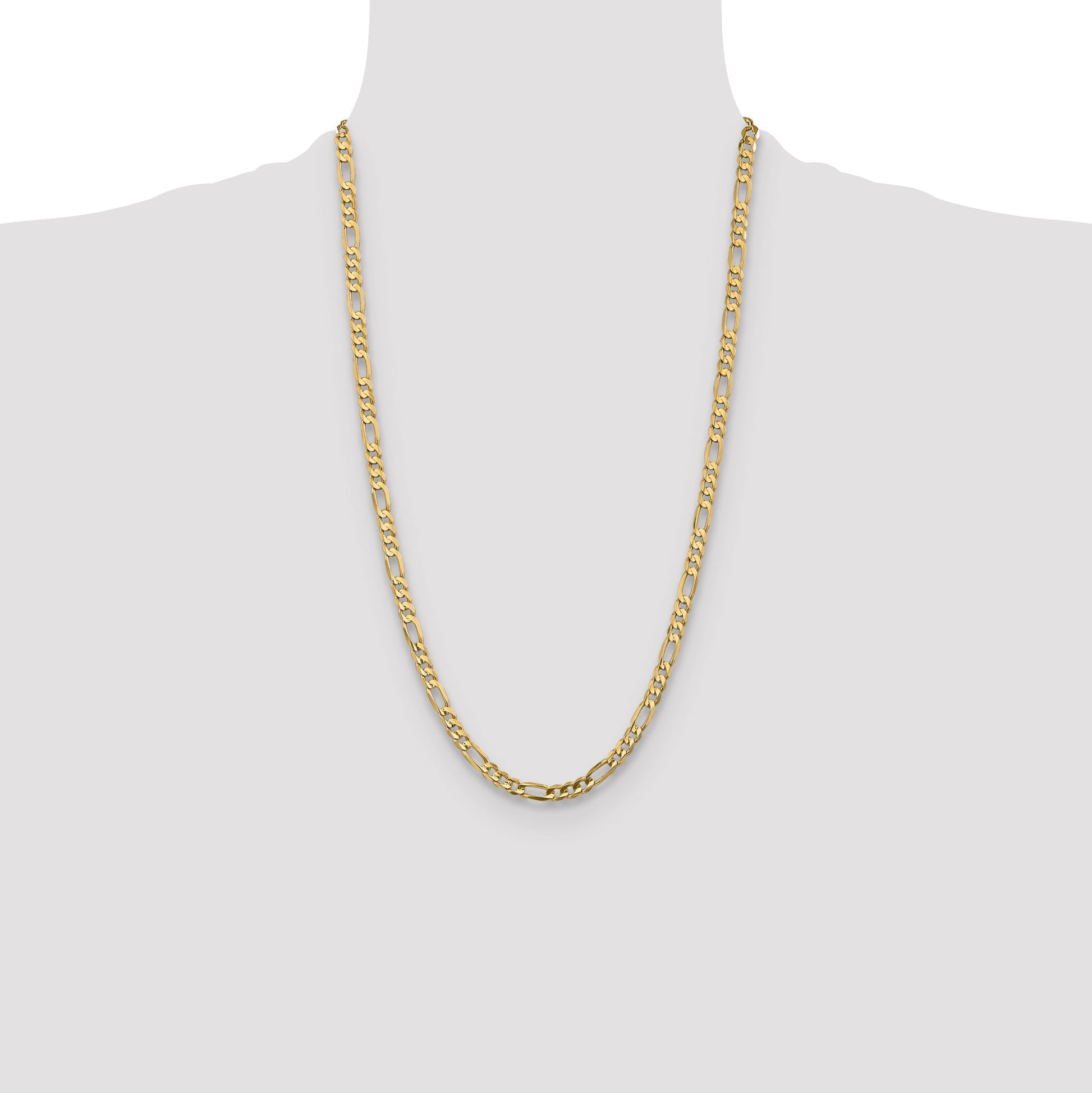 The 10K Yellow Gold 5.25mm Concave Figaro Chain is a stylish piece that adds a touch of class to any look. Crafted from high-quality gold, this solid chain measures 26 inches long and has a unique concave profile. Its polished finish enhances the smooth, shiny surface, making it perfect for daily wear or special occasions. The Figaro style features a pattern of alternating large and small links, creating a bold feel. With a sturdy lobster clasp, this unisex necklace offers durability and easy fastening. The 10K Gold 5.25mm Concave Figaro Chain comes with a lifetime warranty, ensuring lasting beauty and strength.