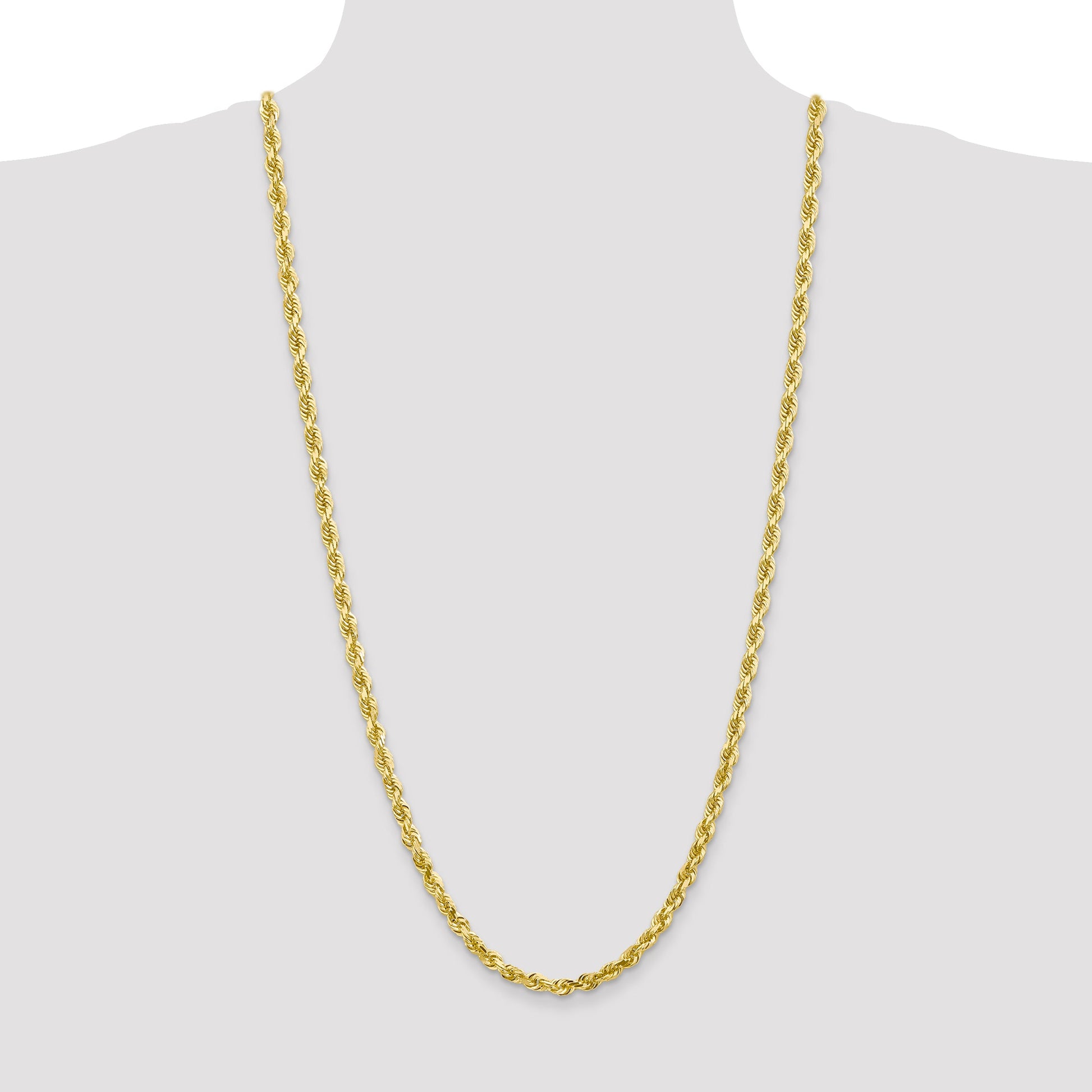 Introducing the stunning 10K Yellow Gold 5mm D/C Quadruple Rope Chain, a piece of elegance and style. Crafted from 10K gold, this necklace boasts a polished finish that gleams with luxury. Measuring 30 inches in length, it lays gracefully on the neck, highlighted by its solid, substantial design. The intricate rope chain, featuring a 5mm width and diamond-cut texture, adds a sophisticated sparkle. Securely fastened with a lobster clasp, this chain ensures both style and durability. Elevate any outfit with the refined charm of this 10K Yellow Gold 5mm D/C Quadruple Rope Chain, designed to leave a lasting impression.